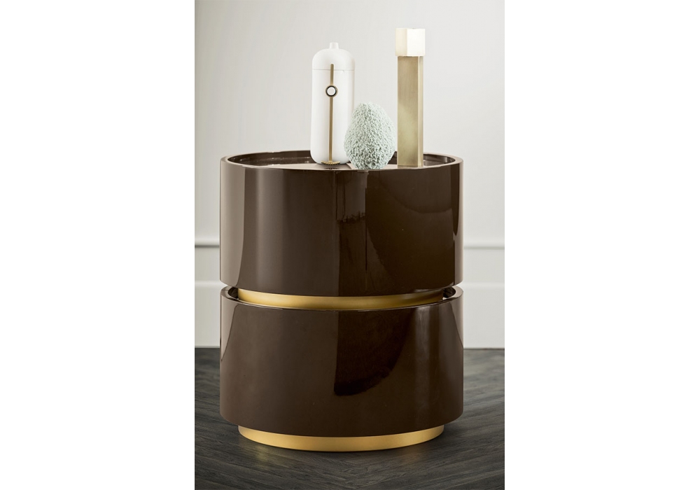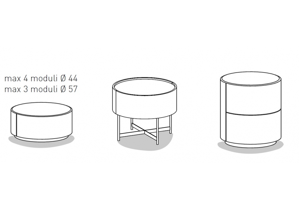 Dedalo designed by Pianca is a collection of cylindrical bedside tables with multiple possibilities of use and customization. Made with structure with wood particle panels and lowered top made with panels, covered with different materials. Available with plinth or with metal base.
