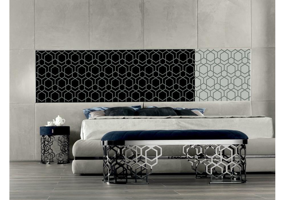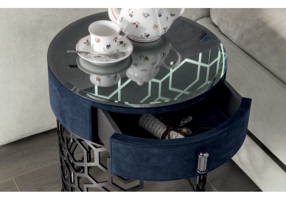 Lucy designed by Giuseppe Iasparra for Longhi is a bedside table with 1 drawer covered in leather and base worked in rectified metal laser cut with "Sequence" decoration and calendered. Marble, mirror or crystal top.