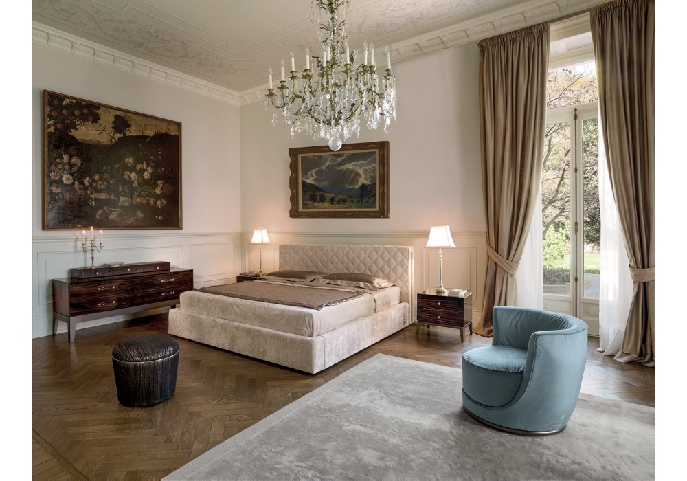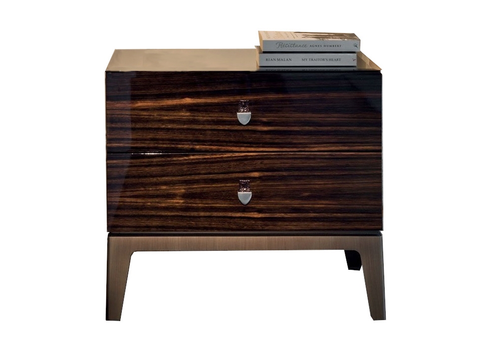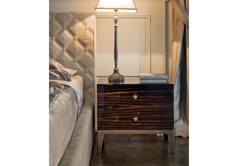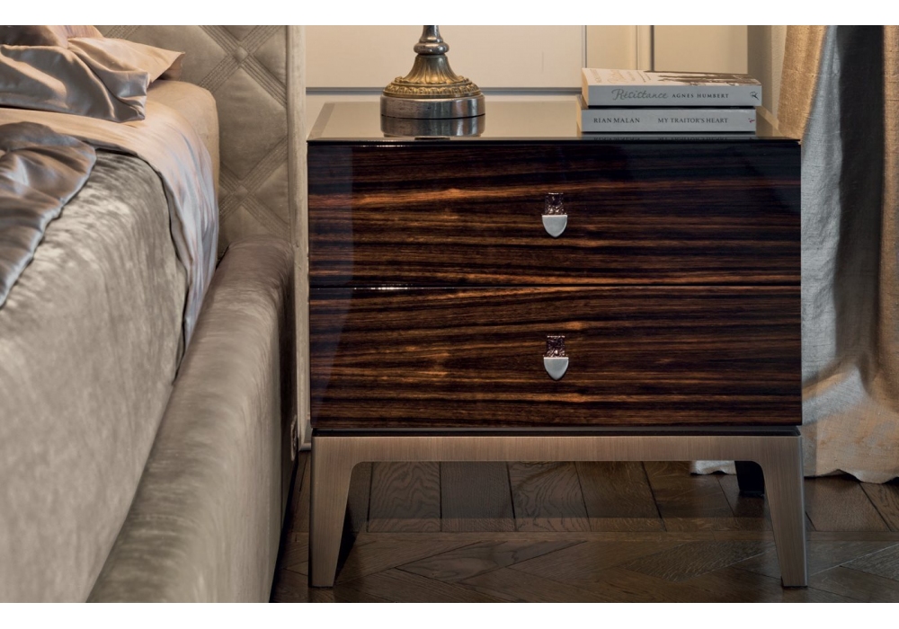 Sir designed by Giuseppe Viganò for Longhi is a bedside table with 2 drawers, structure in veneered or glossy lacquered wood. Mirror top and laser cut ground metal base. The handles are optionally made of marble or leather.