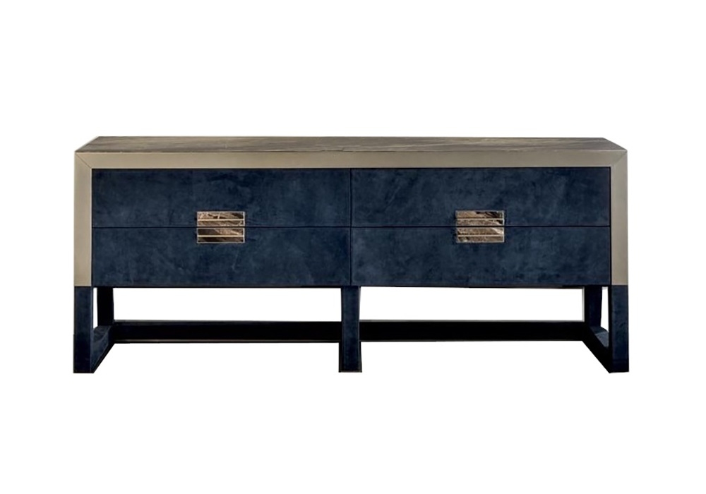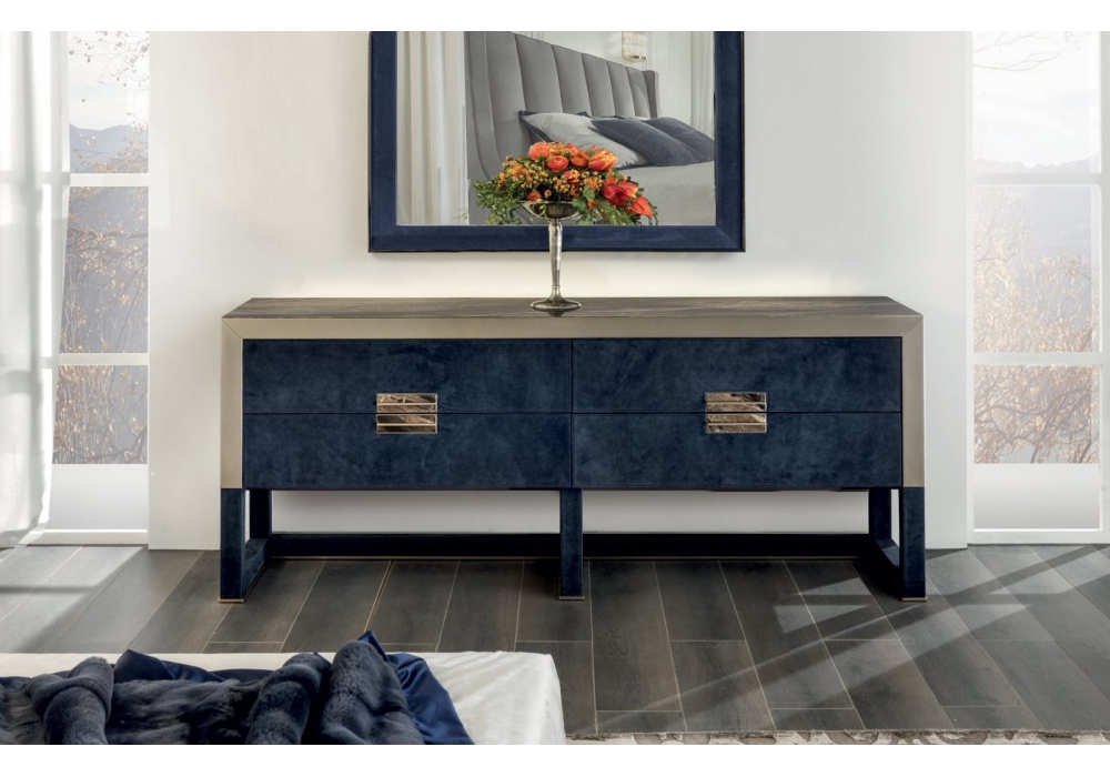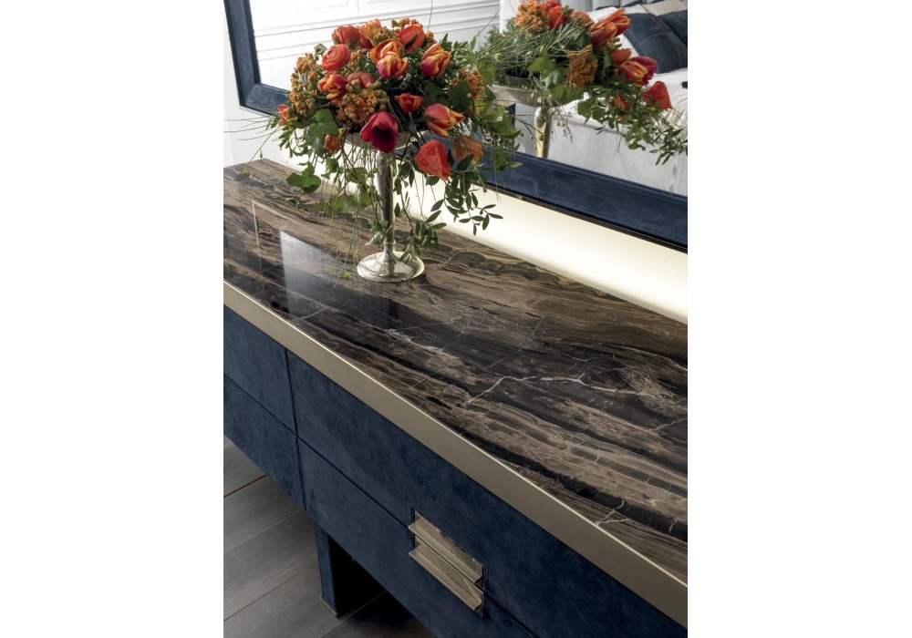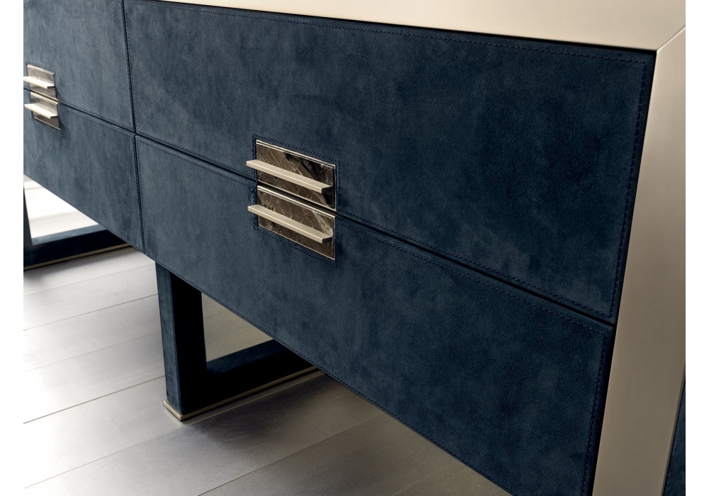 Orwell designed by Giuseppe Viganò for Longhi is a chest of drawers with 4 drawers covered in leather. Metal parts in glossy or matte finish. Structure in wood or covered in leather. Available with marble, mirror or crystal top. As an option, it is possible to insert two dimmable LED strips with touch-sensitive ignition on the back that illuminate the lower and upper part of the cabinet.
