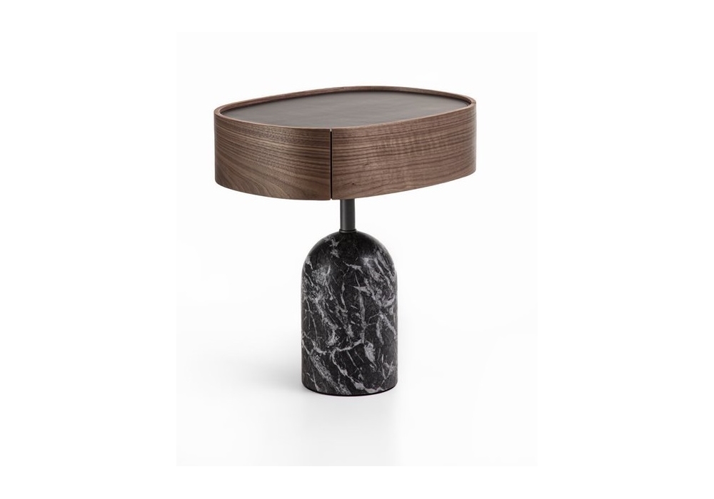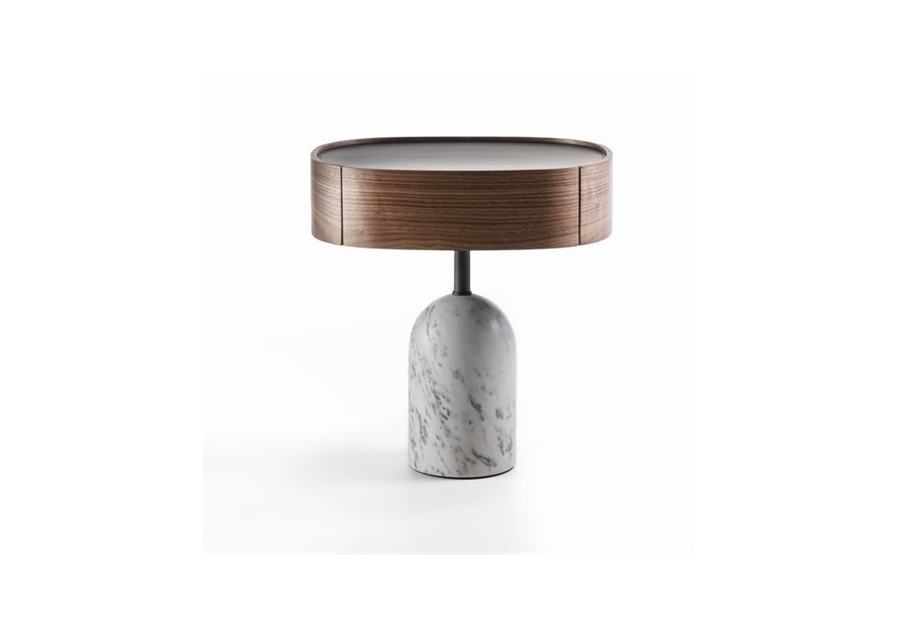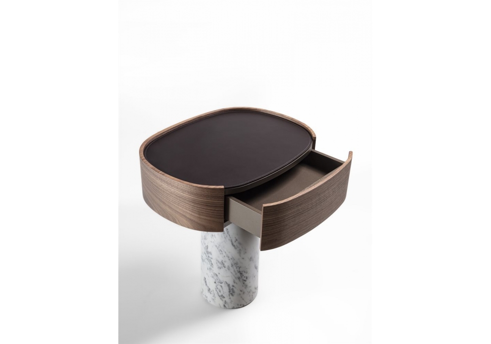 Ekero Night designed by Tollgard & Castellani for Porada is a bedside table with cylindrical base in white Carrara or gray Carnico marble, central stem in metal in pewter gray finish and upper drawer in wood. Top in wood or covered in Cuoietto leather. Interior of the drawer in scratch-resistant titanium finish.