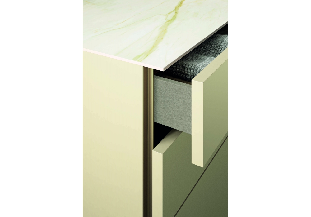 Lama designed by Dall'Agnese is a bedside table characterized by a solid structure in wood particle board, available in melamine, lacquered or painted wood veneer finish. The fronts maintain the same level of quality and finish. The top is available in two variants: stoneware, with randomly cut slabs for a unique effect, or in wood, ensuring elegance and resistance. The drawers, with an internal leather effect, slide on high-sliding metal guides with "Blumotion" soft closing. The opening system occurs via a lateral aluminum groove, while the base is supported by adjustable concealed metal feet.