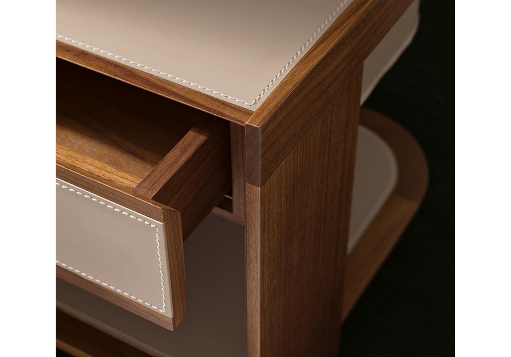 Archibald is a bedside cabinet designed by Roberto Lazzeroni for Giorgetti. Bedside cabinet with the structure in solid walnut canaletto wood made up of one completely removable drawer with recessed sliding runners and silent system closing. The top, the front side of the drawer and the shelf are covered with saddle leather or leather.