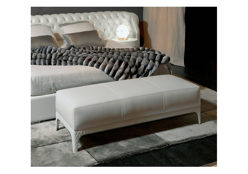 Eliot designed by Rugiano is a pouf / bench upholstered in leather with details in steel or bronze. Available in three sizes. The matelassé workmanship is made only with soft smooth leathers cat. C,D.