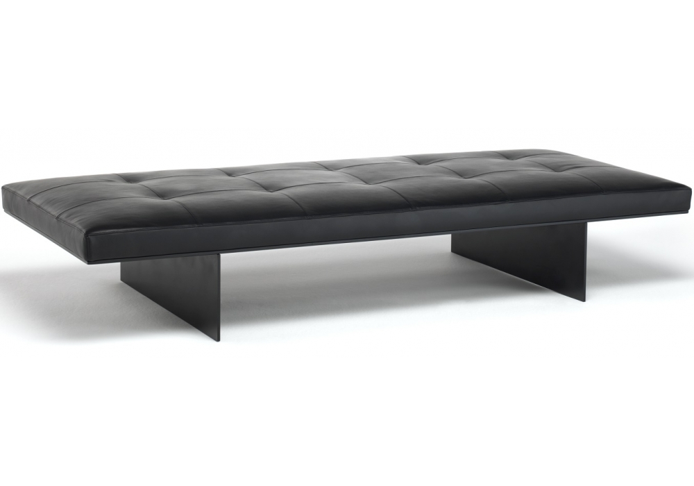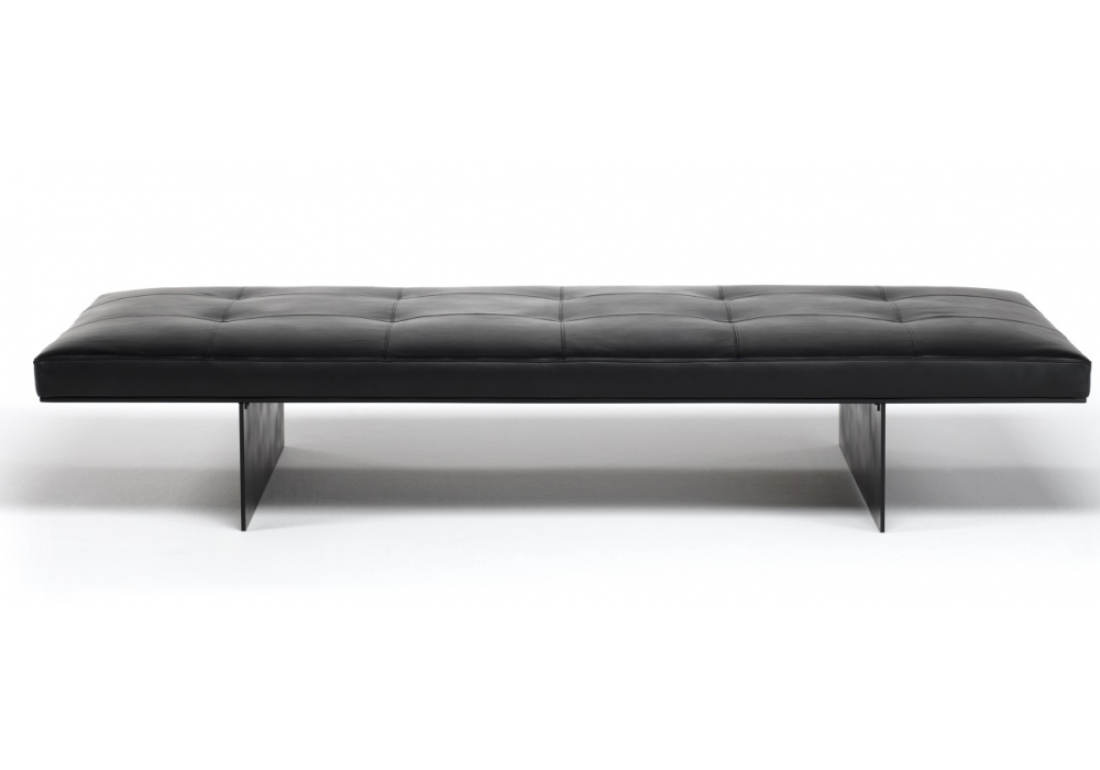 Track designed by David Lopez Quincoces for Living Divani is a bench with supporting steel frame and base in aluminum with black epoxy powder coating. Seat cushion with differentiated density polyurethane foam, mounted on chassis sprung with coated rubber elastic straps. Covering in 100% polyether thermally bonded onto a polyamide velveteen backing. Quilted fabric or leather upholstery, the fabric version only is fully removable by Velcro fastening after unscrewing the chassis from the supporting frame. Seat depth 55-80cm.
