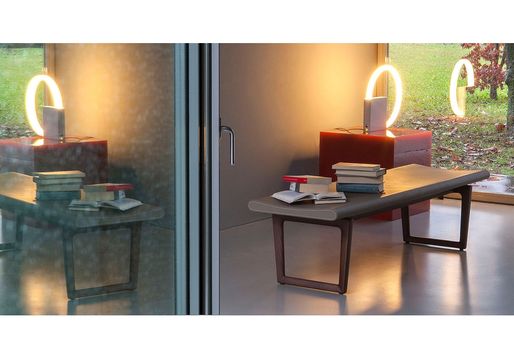 Fidelio designed by Roberto Lazzeroni for Poltrona Frau is a bench with frame in solid ashwood and seat upholstery in saddle leather. Stitching available in tone-on-tone or contrasting version.