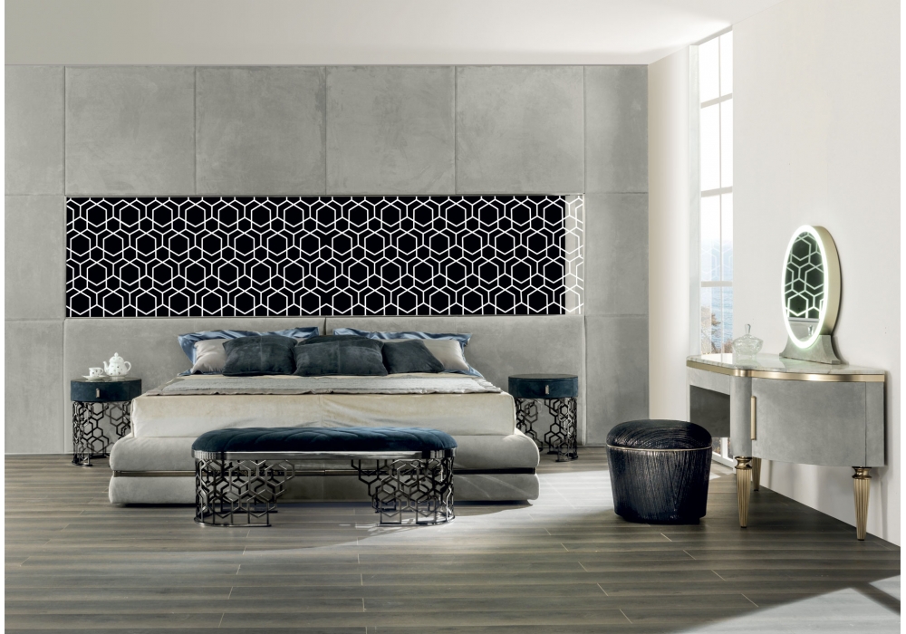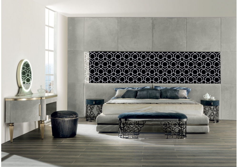 Amanda designed by Giuseppe Iasparra for Longhi is a bench with seat in medium density polyurethane foam, upholstered in fabric or leather. Smooth or quilted cover. Metal base with "Sequence" decoration, available in different finishes.