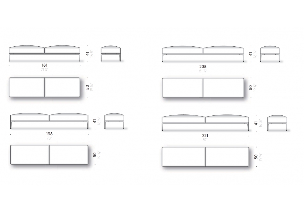 | Dimensions | 181 x 50 x H 41 cm; 198 x 50 x H 41 cm; 208 x 50 x H 41 cm; 221 x 50 x H 41 cm |