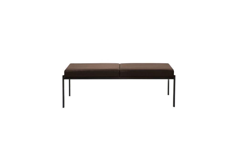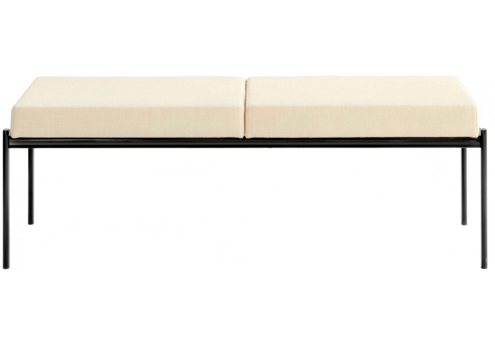 Kiki designed by Ilmari Tapiovaara for Artek is a bench made with a glossy black powder coated structure and seat upholstered in fabric or leather. Available in different dimensions.