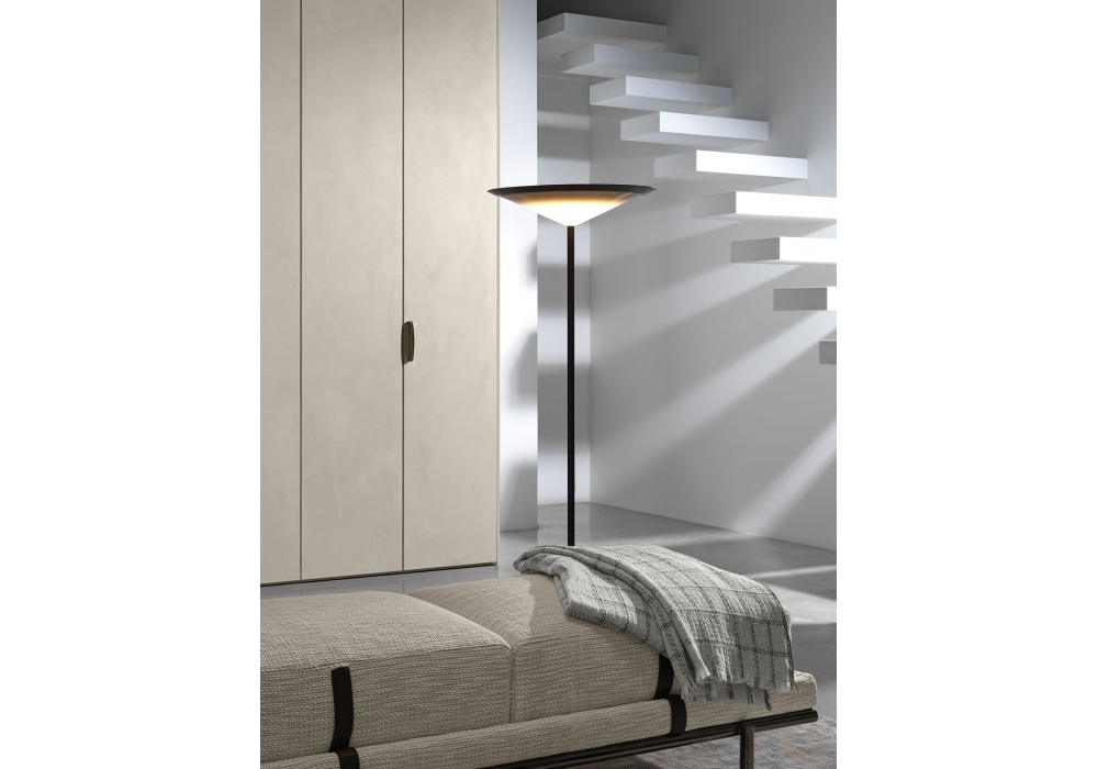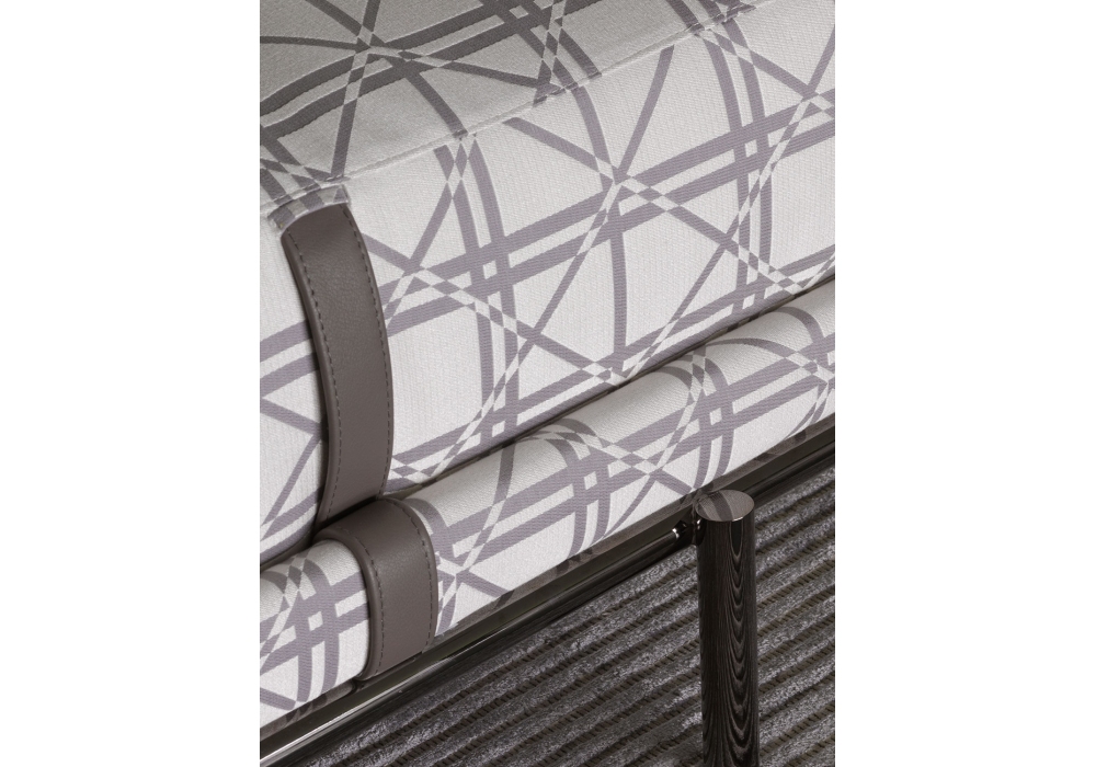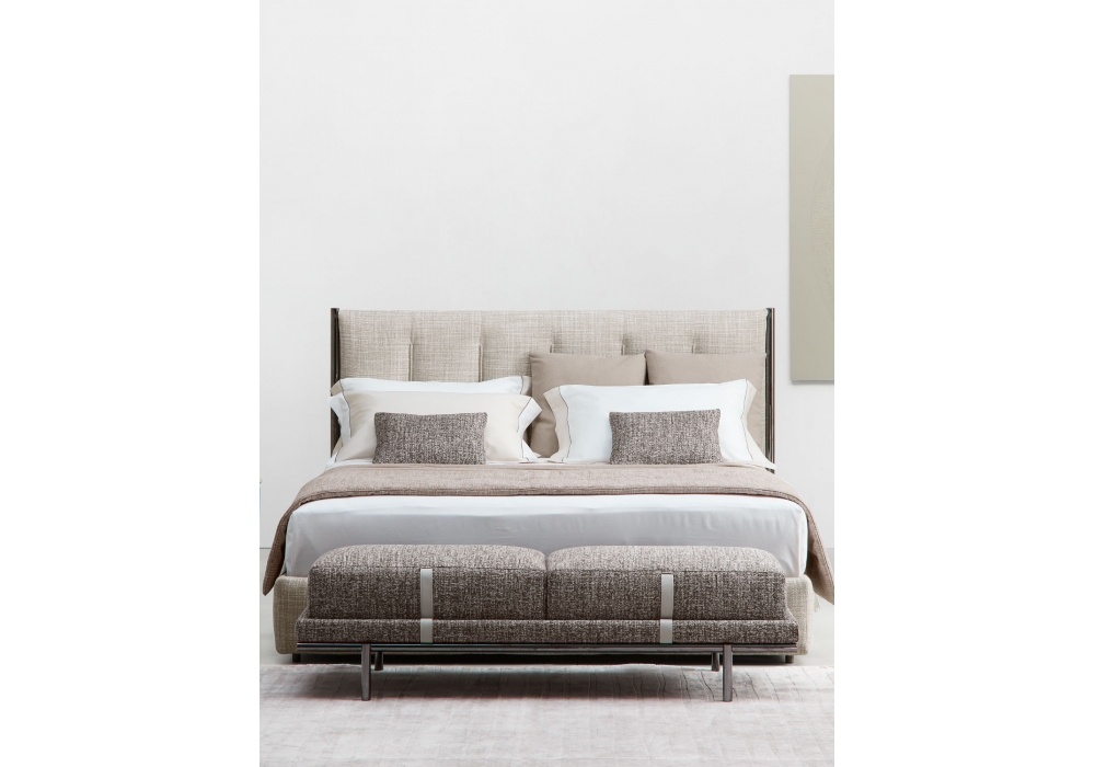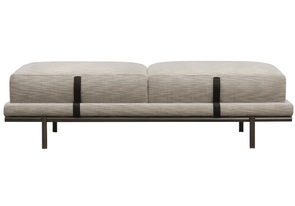 New Bond designed by Matteo Nunziati for Flou is an upholstered bench with metal structure and cylindrical legs in matt burnished or glossy black nickel finishes. Covering in fabric or leather with leather belts.
