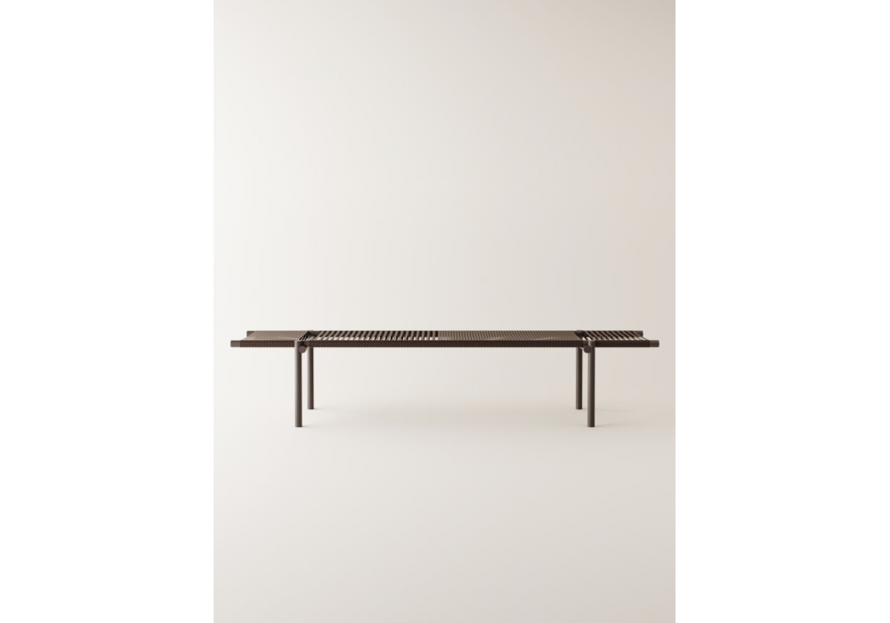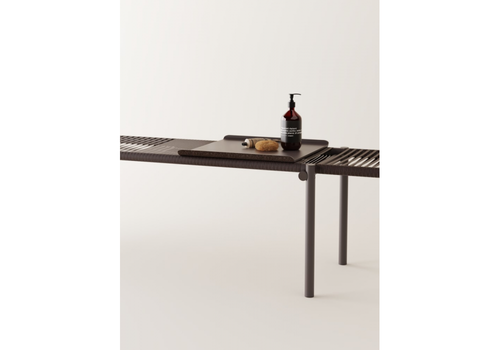 Rendez-vous designed by Marco Carini for Agape is a bench with a painted aluminum frame. The support surfaces are made of toasted cork strips, with a technical core in hand-woven nylon. As accessories, aluminum trays painted in the same finish as the frame can be added.