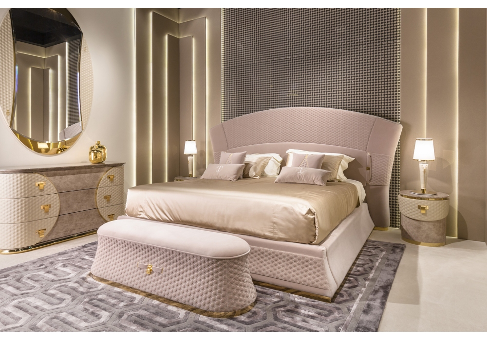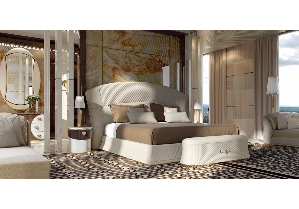 Vogue designed by Andrea Bonini for Turri is a bench with structure in plywood and solid wood padded with polyurethane foam. Cover in non-removable fabric or leather with hexagonal embroidery on the structure. Metal base in gold finish.