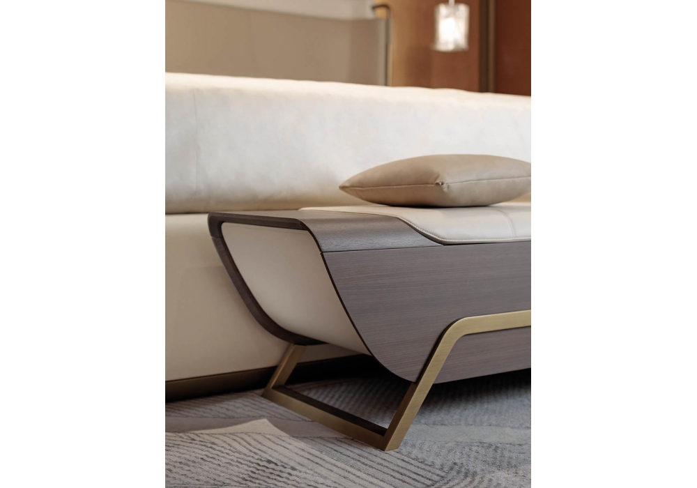 Melting Light designed by Frank Jiang for Turri is a bench with structure in walnut veneered plywood and solid wood. Cover in non-removable leather or fabric. Metal legs in brushed gold or bronze finish.