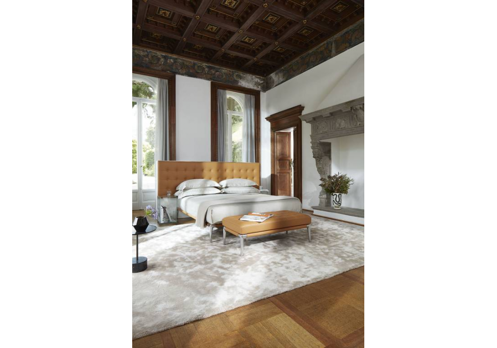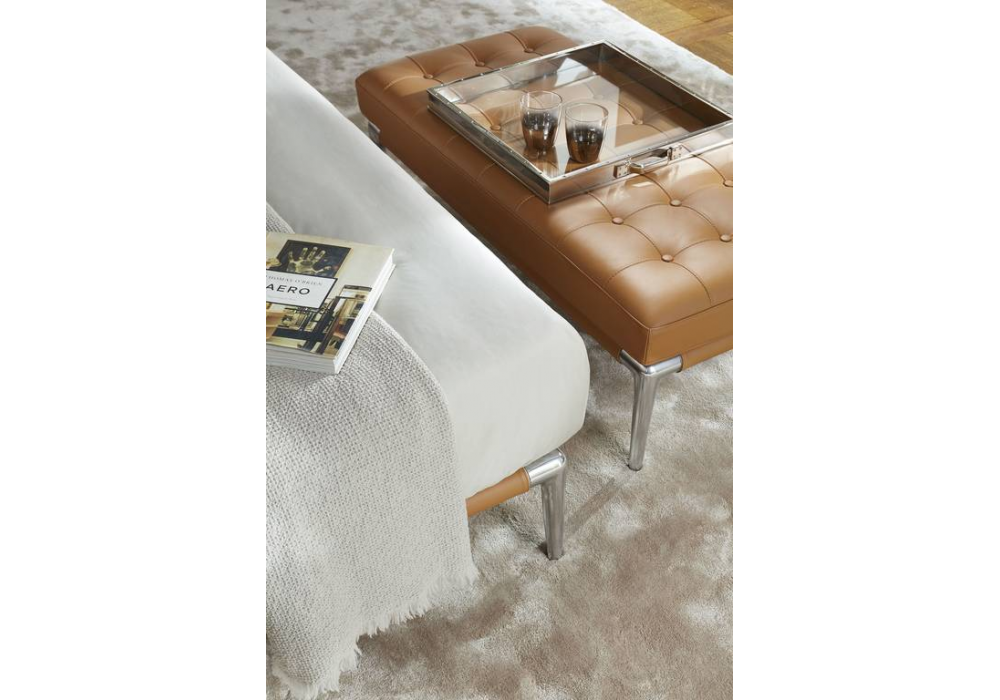 L26 Volage designed by Philippe Starck for Cassina is a bench with structure in polished aluminum and capitonné upholstery in fabric or leather.