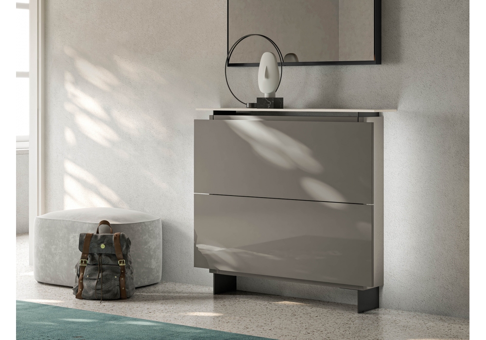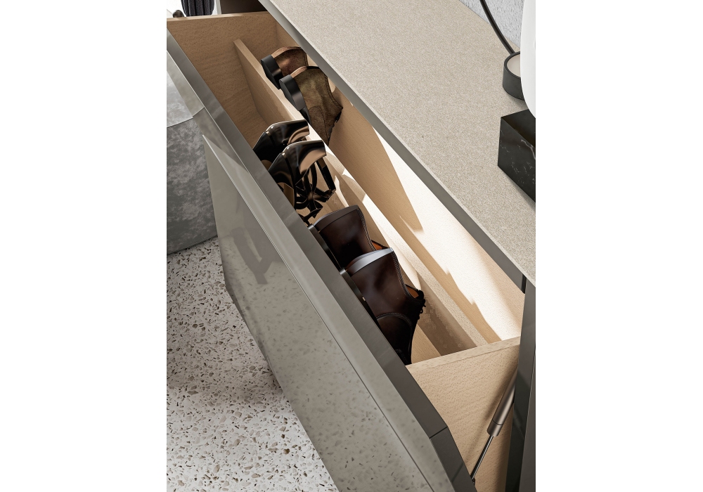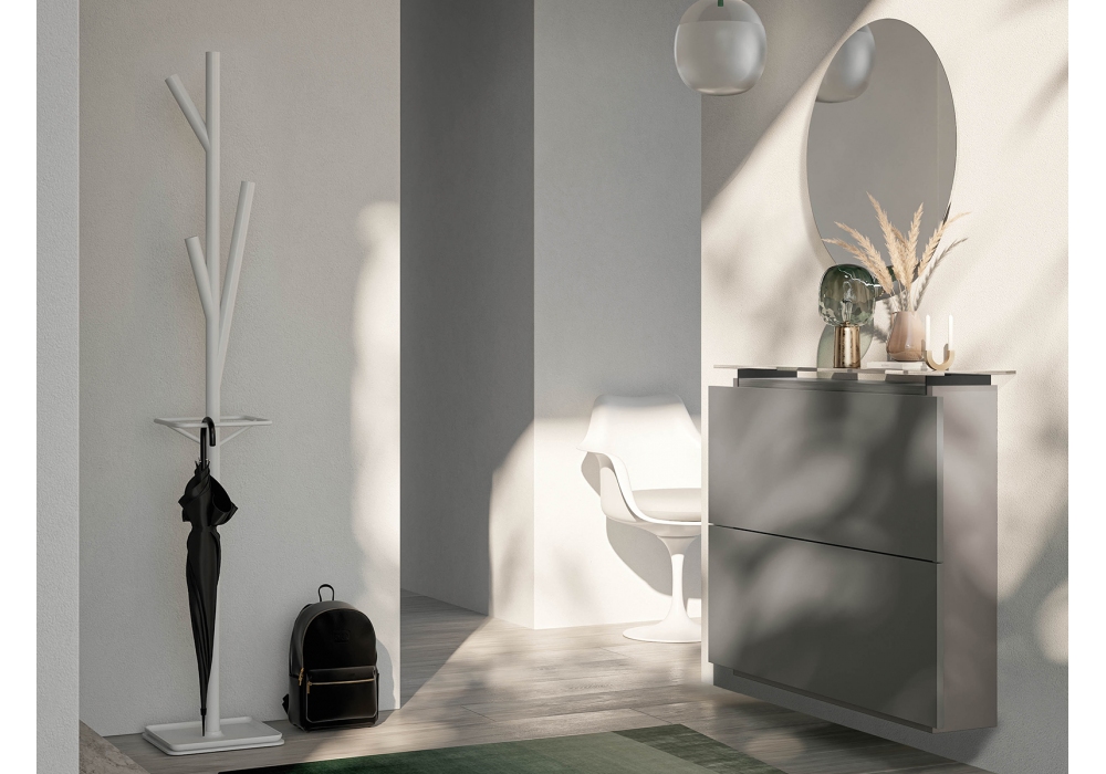 Hosoi designed by Birex is a shoe rack with a structure made of certified particle board panels covered with melamine or lacquered. Opening by means of a lateral grip on the door. Internal shoe rack in birch plywood and anthracite plastic supports and metal base. Extralight transparent glass top.