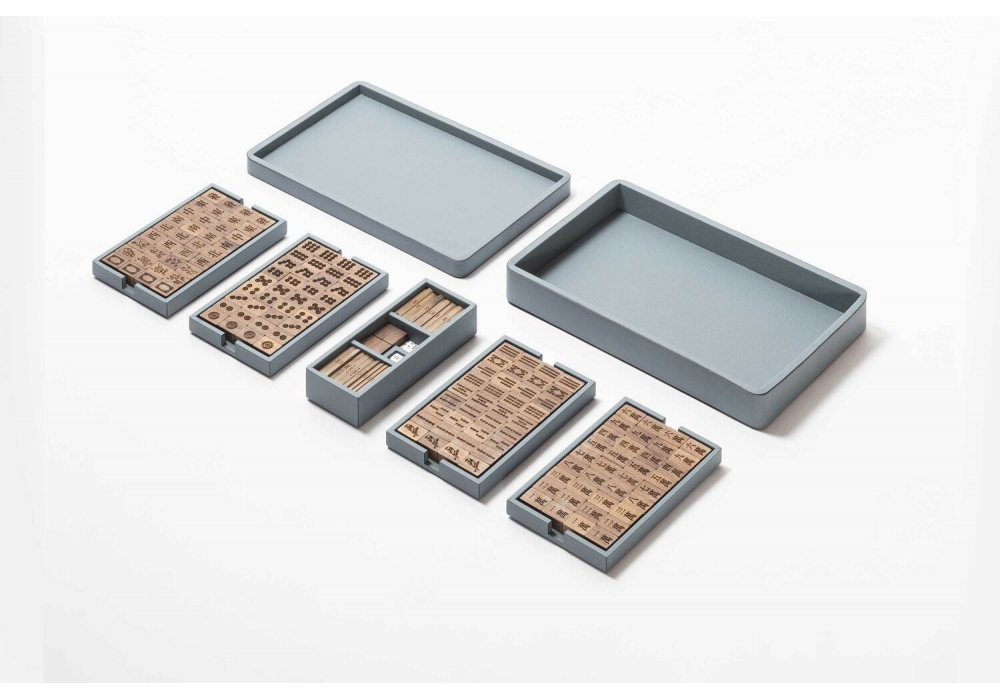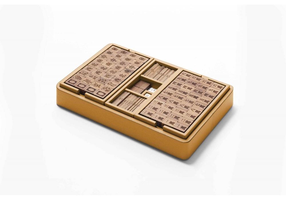 Mahjong designed by Giobagnara x Poltrona Frau is housed inside a precious wooden box covered in Pelle Frau® leather, inside of which are 148 walnut wood tiles, 244 walnut wood sticks, 4 standard opaque plexiglass dice, 1 opaque plexiglass dice (with initials of the cardinal points on its faces), 4 trays to contain the tiles and 1 tray to contain the dice and sticks.