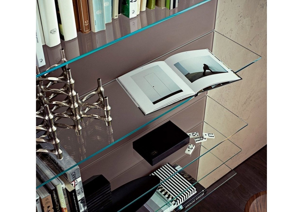 Elle Plus 10 designed by Studio G&R for Gallotti&Radice is a wooden boiserie covered byextralight mirror or smoked "grigio Italia" mirror or painted glass as per samples in the bright or satin version. Also available in natural ash, tobacco stained, wengè stained or black lacquered open pore. 8mm extralight or smoked "grigio Italia" glass shelves. Bright aluminium frame.