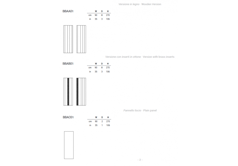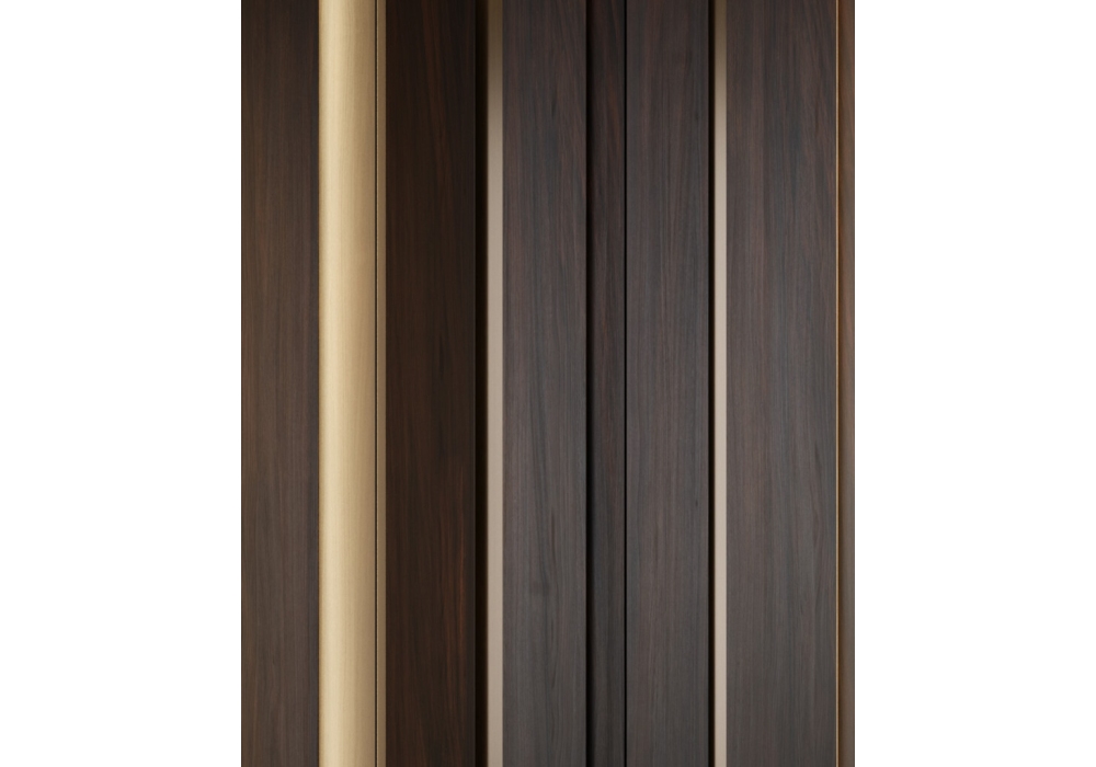 Fractal Boiserie designed by Elena Pancaldi for Emmemobili is a modular system (90xH.270 cm) made with panels characterized by the repetition of linear elements, shaped in their section. Made of veneered plywood or with brass inserts. Possibility of inserting vertical LED lights to create a play of light.