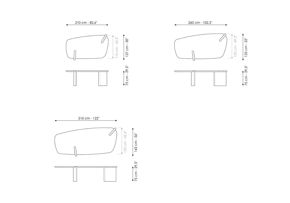 | Dimensions | 210 x 115 x H 75 cm; 260 x 125 x H 75 cm; 310 x 133 x H 75 cm. |
