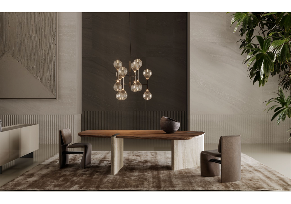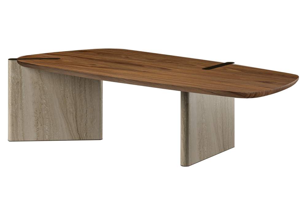 Flatiron designed by Mauro Lipparini for Bonaldo is a table with a walnut or oak veneered wood top and a base in the same color as the top or in marble. Metal inserts.