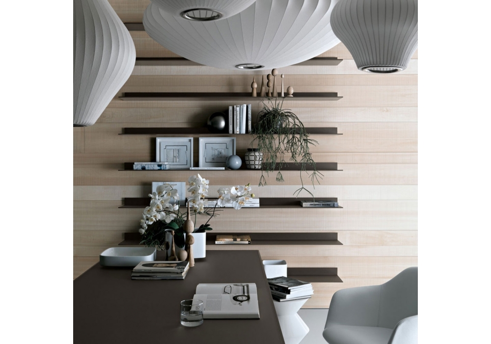 Eos designed by Giuseppe Bavuso for Rimadesio is a wall shelves system with integrated lighting, with aluminium lacquered structure and glass top. The main feature of the project is the thickness of only 8 mm, result of technological research, aimed at ensuring total reliability, making the most of the aesthetic qualities of the materials.