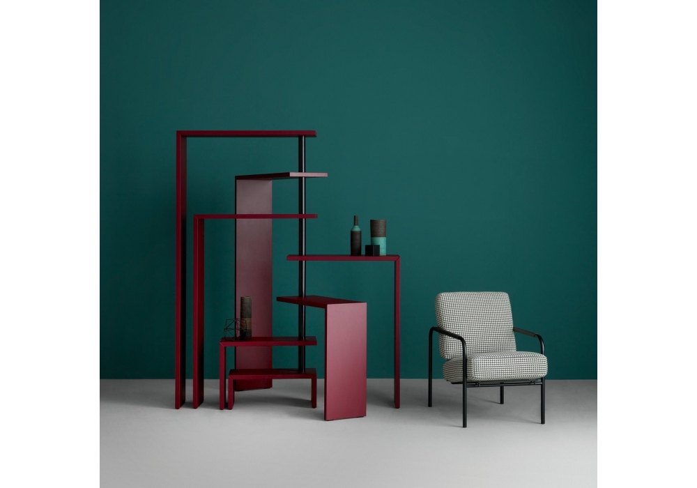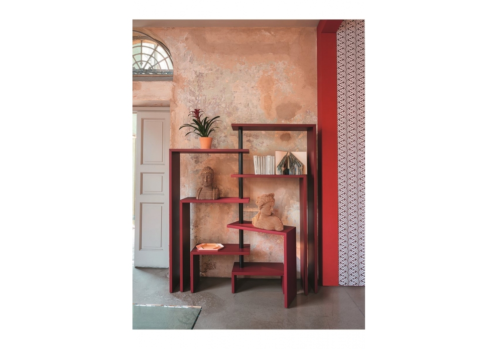 712 Joy designed by Achille Castiglioni for Zanotta is a rotating shelf unit with shelves in medium density fiberboard with internal reinforcing corner element in steel, scratch-resistant embossed paint in white, black or burgundy. Supporting joints in black painted steel in the black or burgundy versions or white in the white version. Available in the version with five or seven shelves.