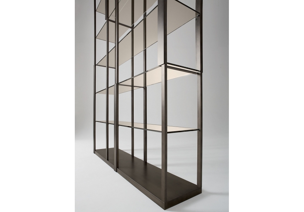 Tortona designed by Massimo Castagna for Gallotti&Radice is a shelving system in patinated bronze lacquered metal. 8mm bronze stopsol or extralight tempered glass shelves. Top also available with recessed Calacatta Vagli Oro marble (only for the versions 65h cm and 92h cm, on request).