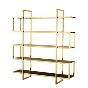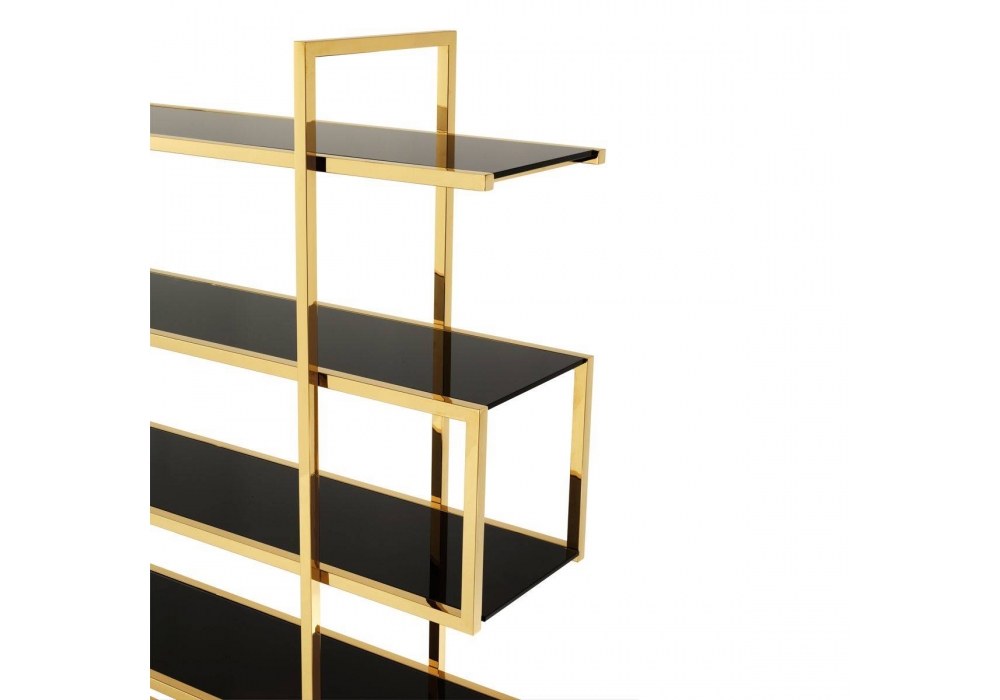 Soto designed by Eichholtz is a cabinet with five shelves in black glass and bright gold polished stainless steel frame. Perfect for lounges or living areas.