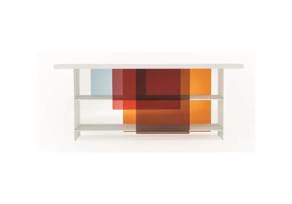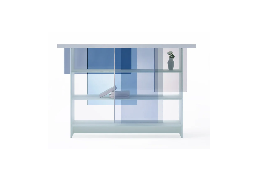 Layers designed by Nendo for Glas Italia is a bookcase realized in extralight matt white crystal. This coloured glass technique which involves inserting coloured films between two sheets of glass, and applying heat to them is the expertise of Glas Italia. The doors are available in two tone of colours: warm (orange, red, brown) and cool (light blue, grey, violet).