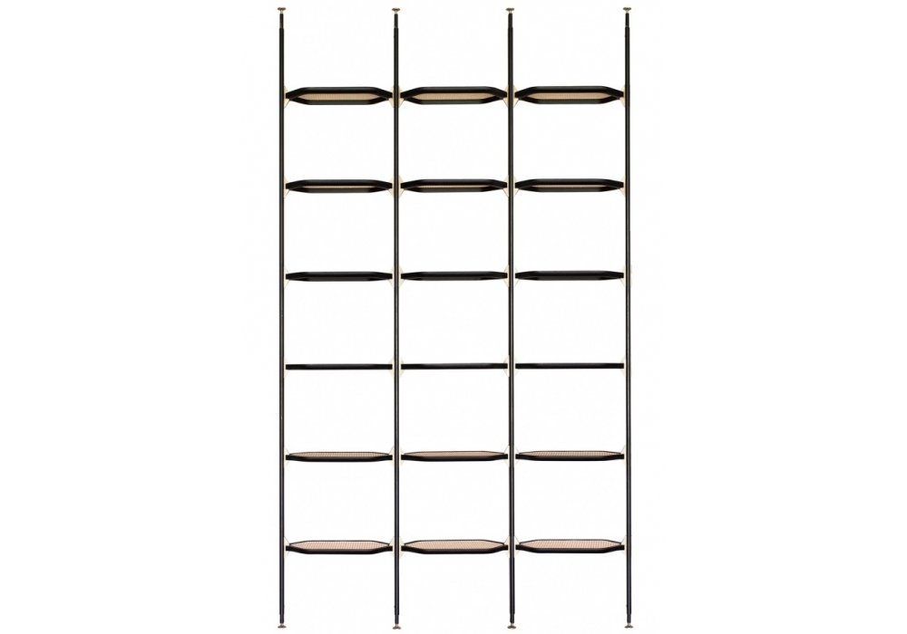 Libelle designed by Pietro Russo for Baxter is a modular bookcase with bearing structure in matte black-varnished metal, fastened to ceiling and floor through satin brass pressure pins. Shelves’ supports in satin brass. Shelves with frame in black-stained maple with inside in cane or leather-covered.