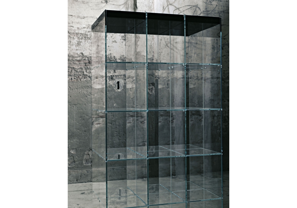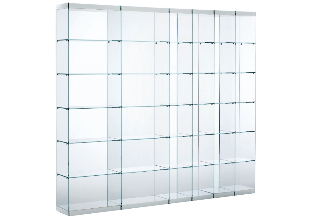 Space designed by Ennio Arosio for Glas Italia is a single or double faced bookcase with modules of various width and depth in tempered mm.10 thick glass. The sides and the glass plates are in transparent extralight. The base and the top are in glossy lacquered glass. The back is in transparent extralight or glossy lacquered glass.