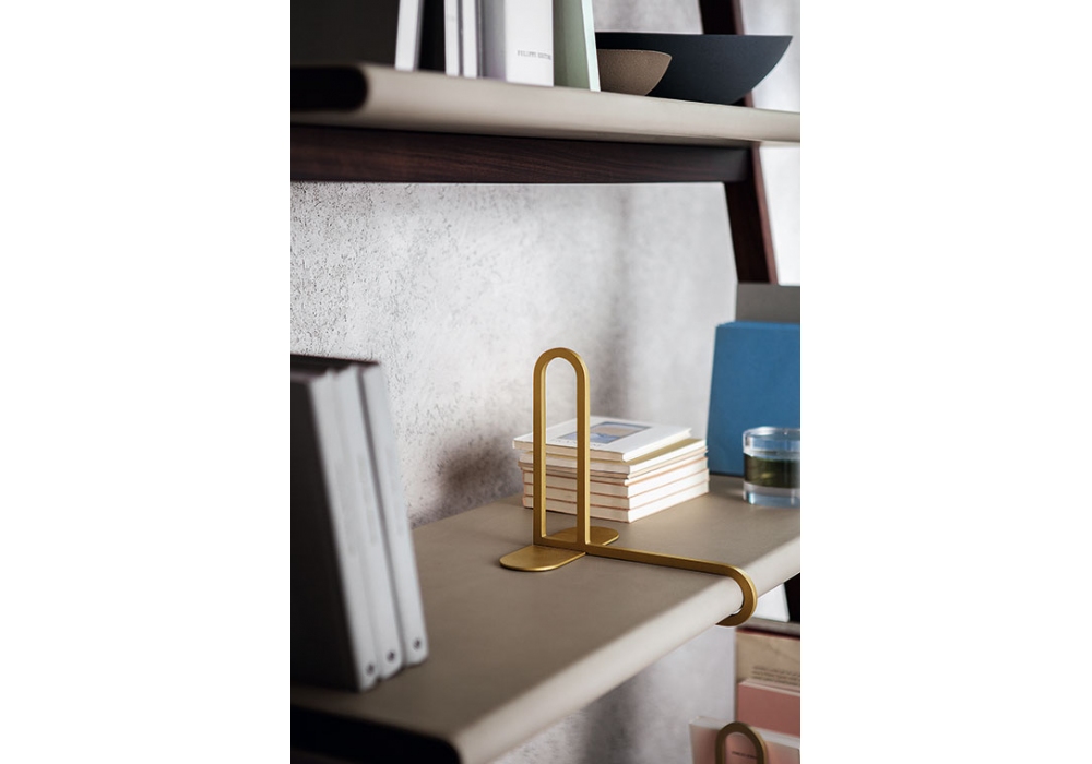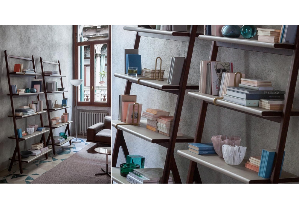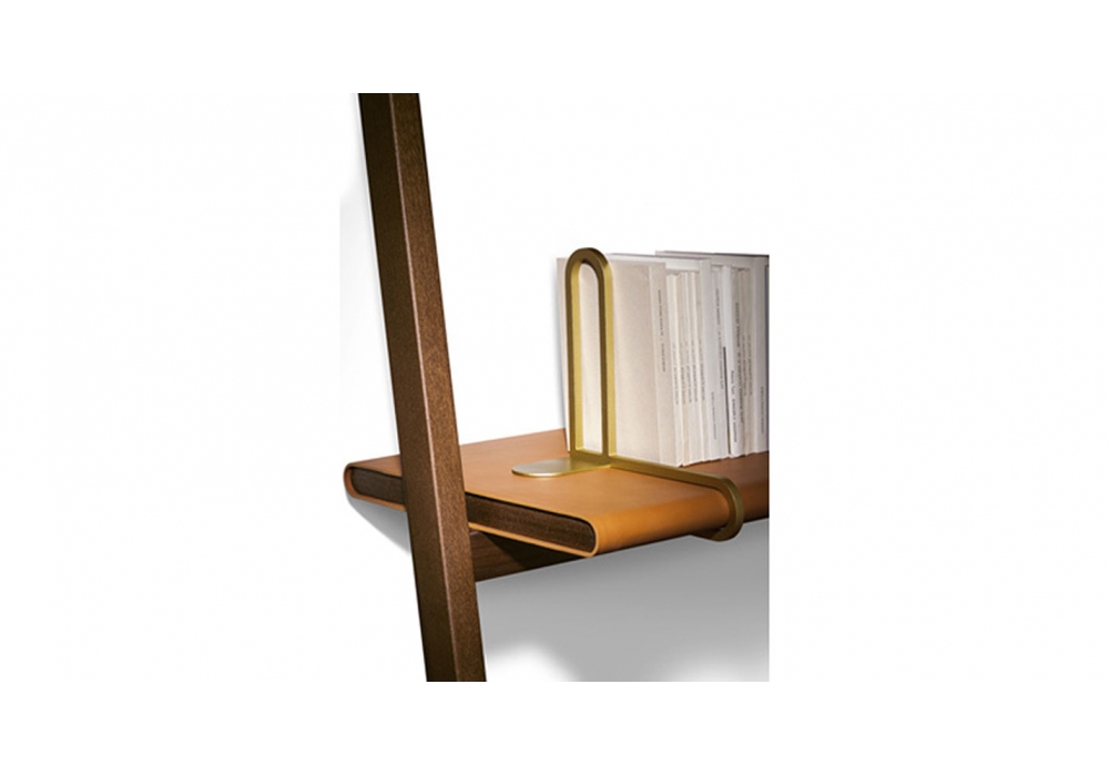 Ren designed by Neri & Hu for Poltrona Frau is a bookrest with structure in solid Canaletto walnut and shelves upholstered in Cuoio Saddle Extra leather. Brass details. Available in different dimensions.