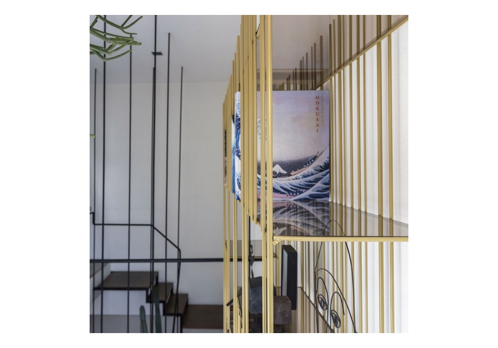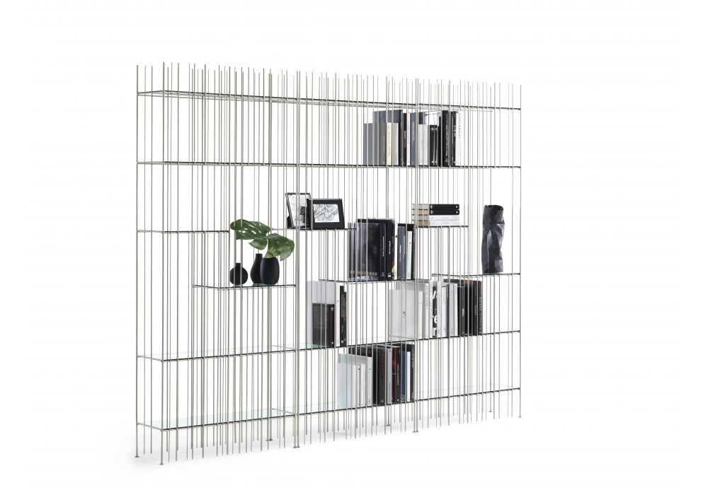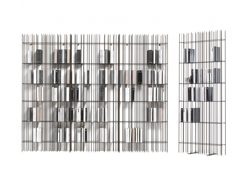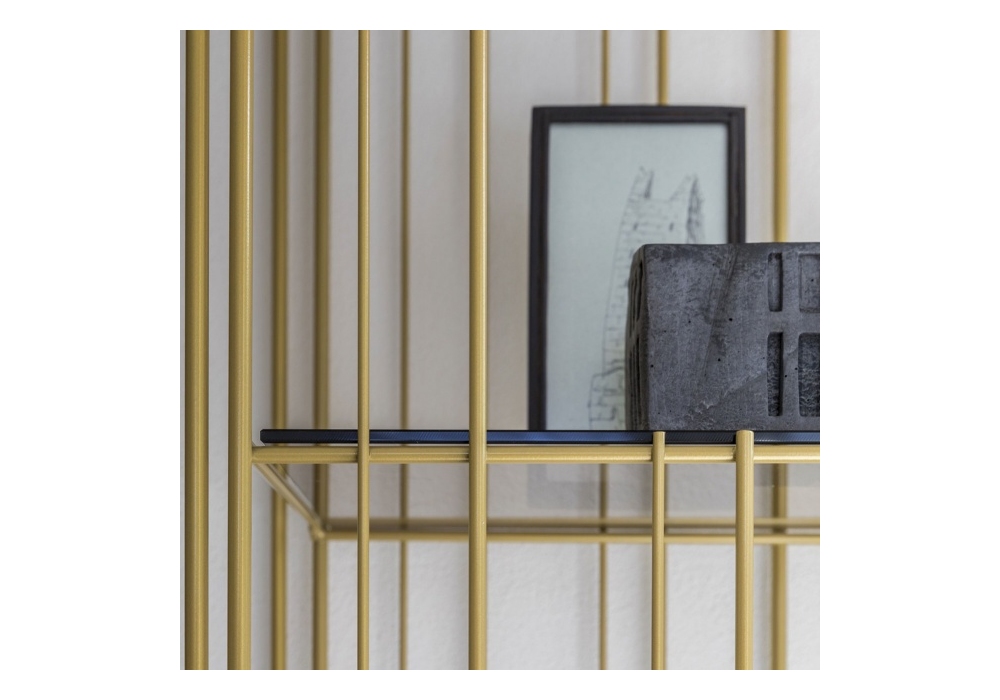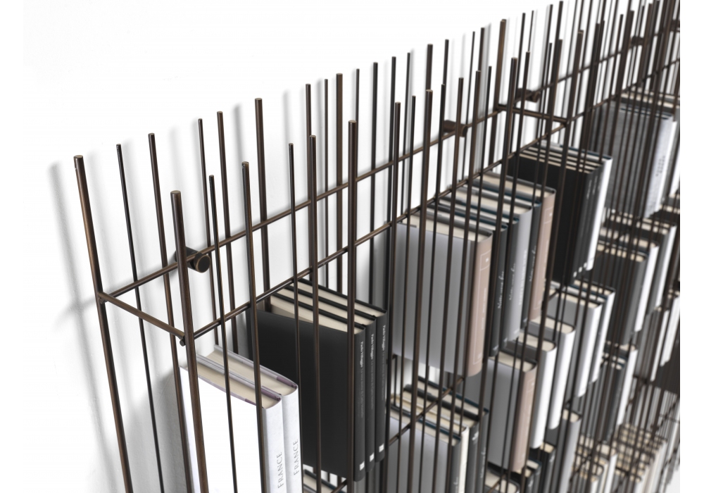 Metrica designed by Ctrlzak Studio for Mogg is a metal booshelf available in 4 finishes: burnished, titanium, gold and white RAL 1013 and shelves in bronze, green or white extra light acid-etched glass. Wall mounting is recommended.