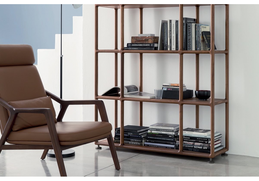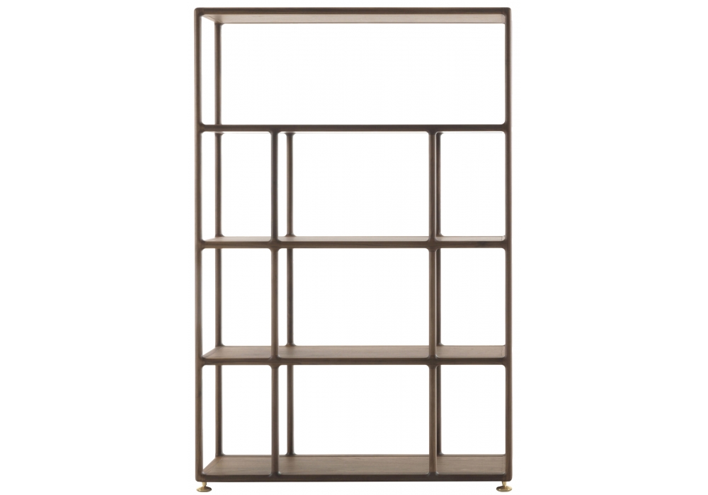 Biblo designed by T. Colzani for Porada is a bookshelf in solid canaletta walnut or matt lacquered closed pore in different finishes. Base in brushed bronzed brass.