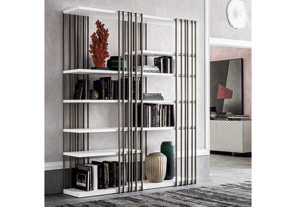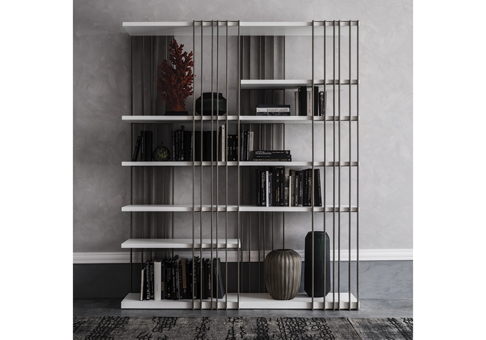 Arsenal designed by Alessio Bassan for Cattelan Italia is a modular bookcase with structure in white, black, titanium or graphite embossed lacquered steel. Shelves in Canaletto walnut, burned oak, embossed white or graphite painted wood. It can be assembled right or left. Available in different models.