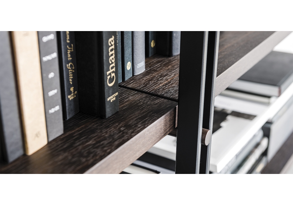Hudson designed by Giorgio Cattelan for Cattelan Italia is a modular bookcase with structure made of white, black, titanium or graphite embossed lacquered steel. Shelves in Canaletto walnut, burned oak, embossed white or graphite painted wood. Details in satin bronze lacquered steel.
