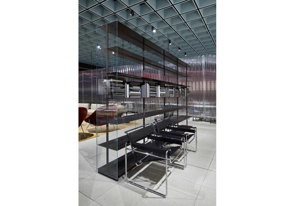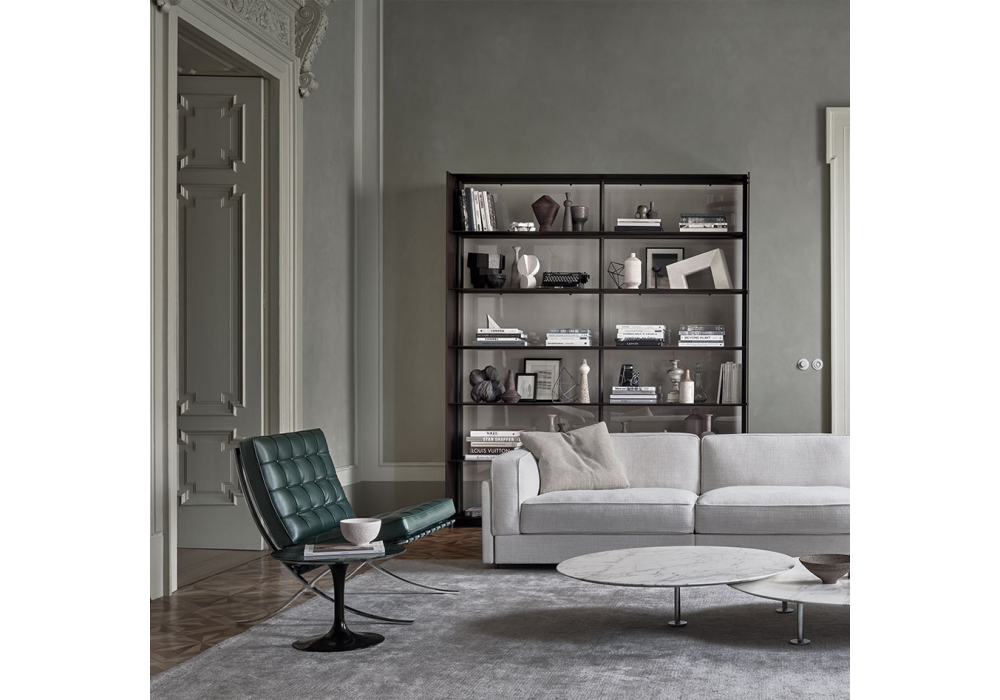 Red Baron designed by Piero Lissoni for Knoll is a modular booshelf with a structure made of anthracite painted aluminum; the back and sides are in tempered glass. The shelves are single pieces of two or three meters made of extruded aluminum. The ends of the legs are equipped with steel feet for height adjustment.