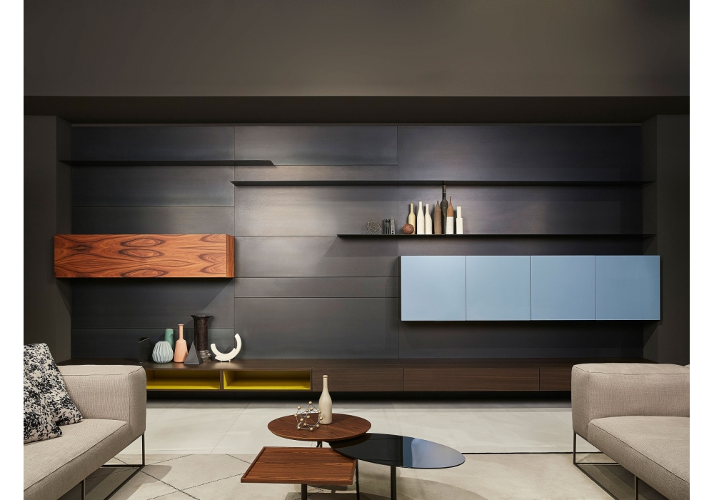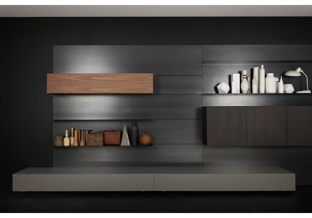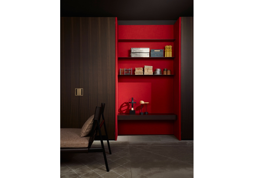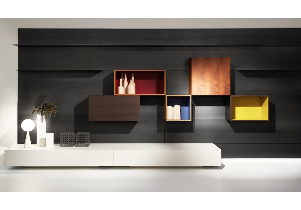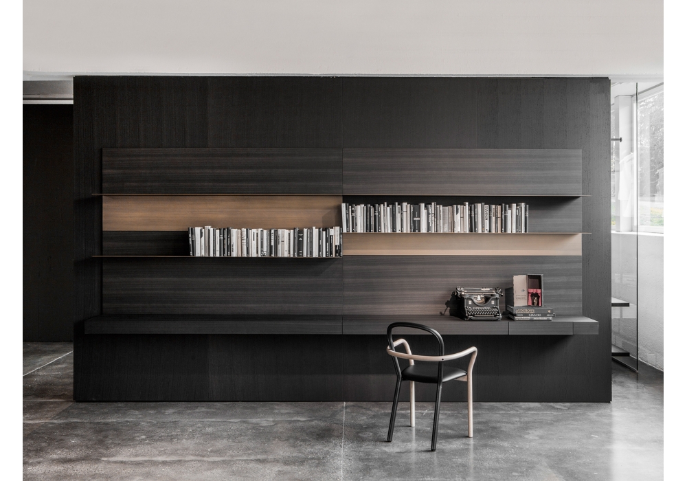 Load-It designed by Wolfgang Tolk for Porro is a modular bookcase made with wooden wall panels available in different finishes. Shelves in steel, white, burnished brass, grigio porfido or rosso antico.