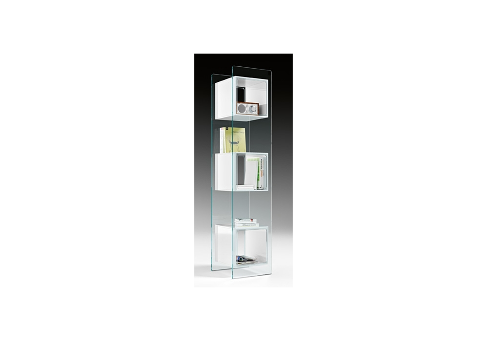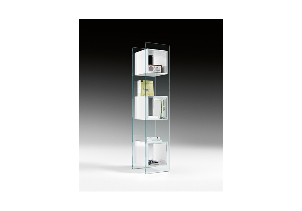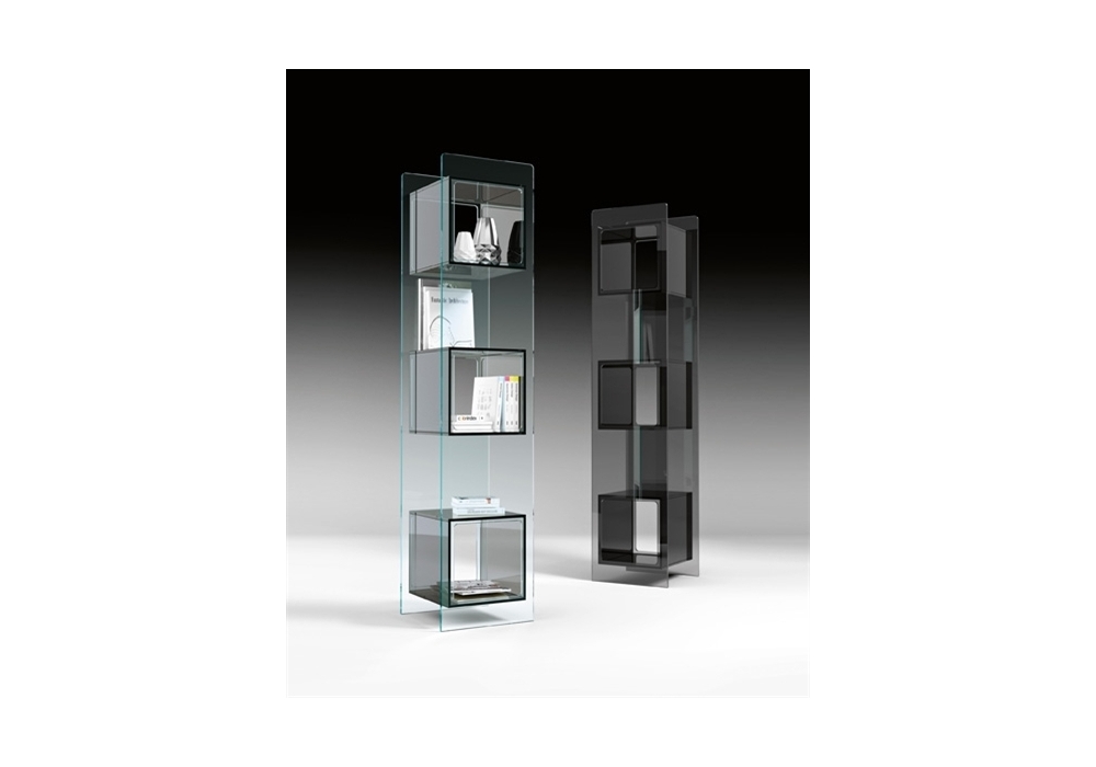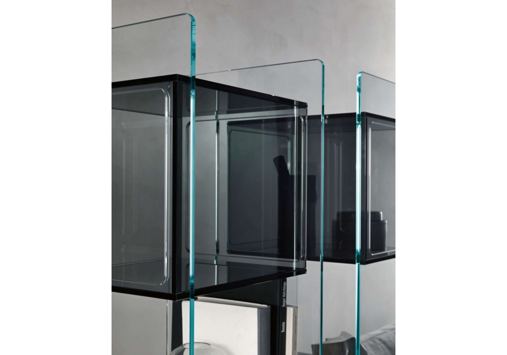 Magique Totem designed by Studio Klass for Fiam is a display cabinet with container cubes in welded glass made in different finishes. Structure in extralight or smoked glass.