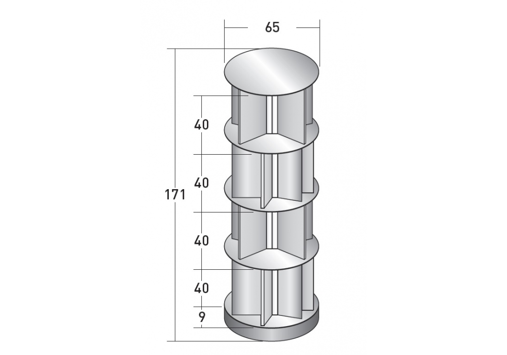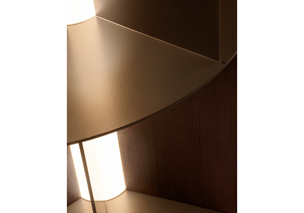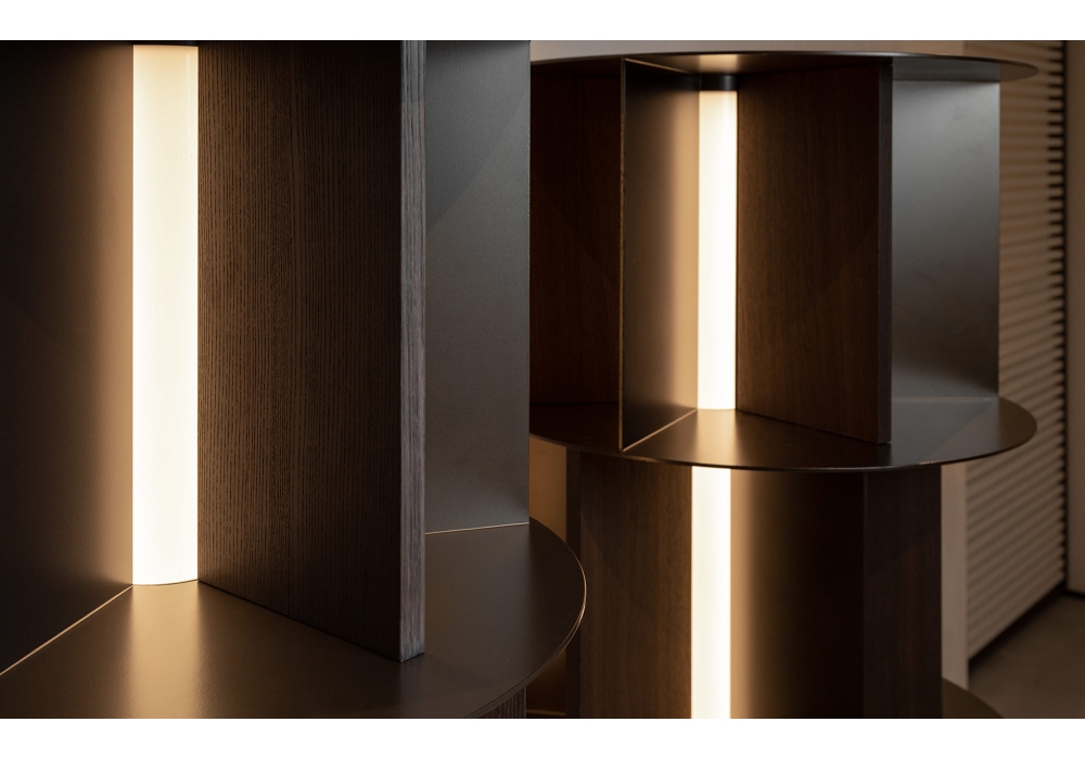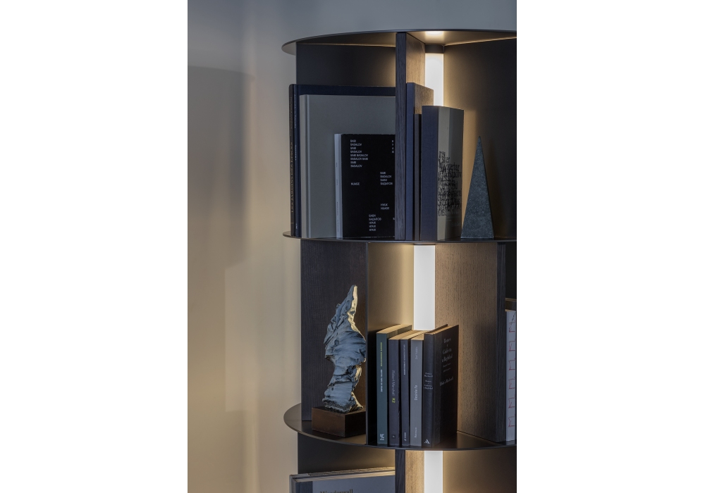 Babele designed by Matteo Nunziati for Natevo is a swivel bookcase with four horizontal shelves and vertical dividers of different depths. The metal and wood structure incorporates in the center a column equipped with LEDs which, in addition to illuminating, also acts as a rotation axis.