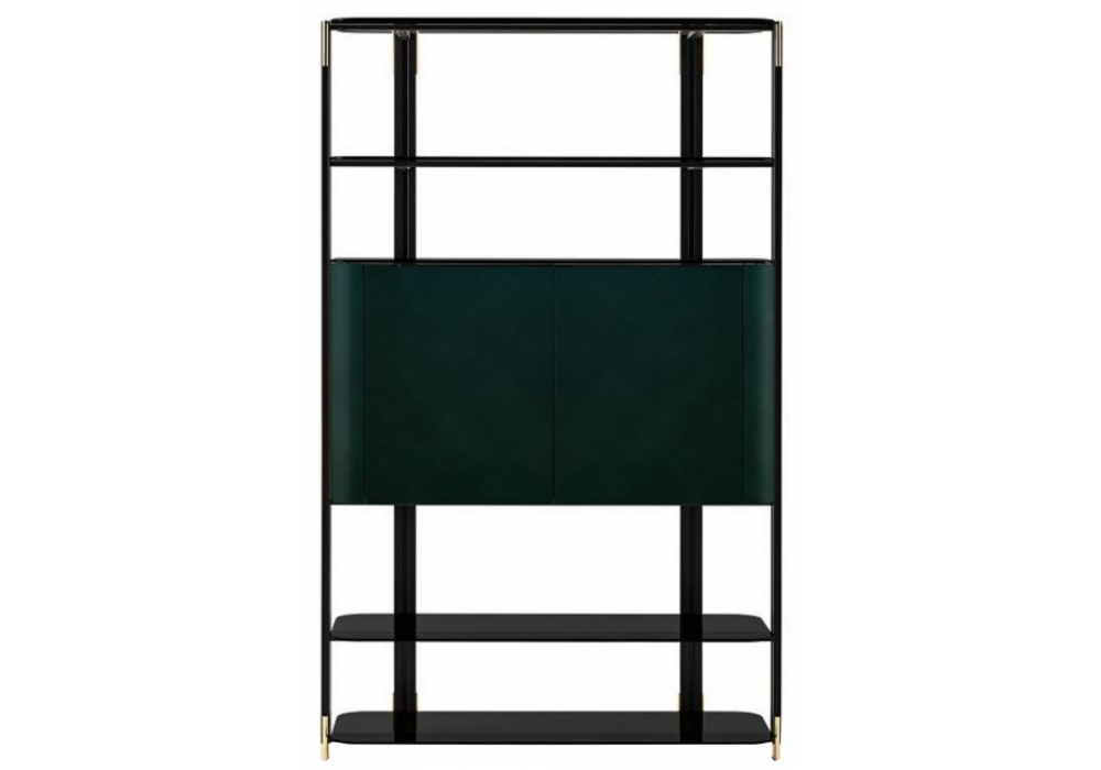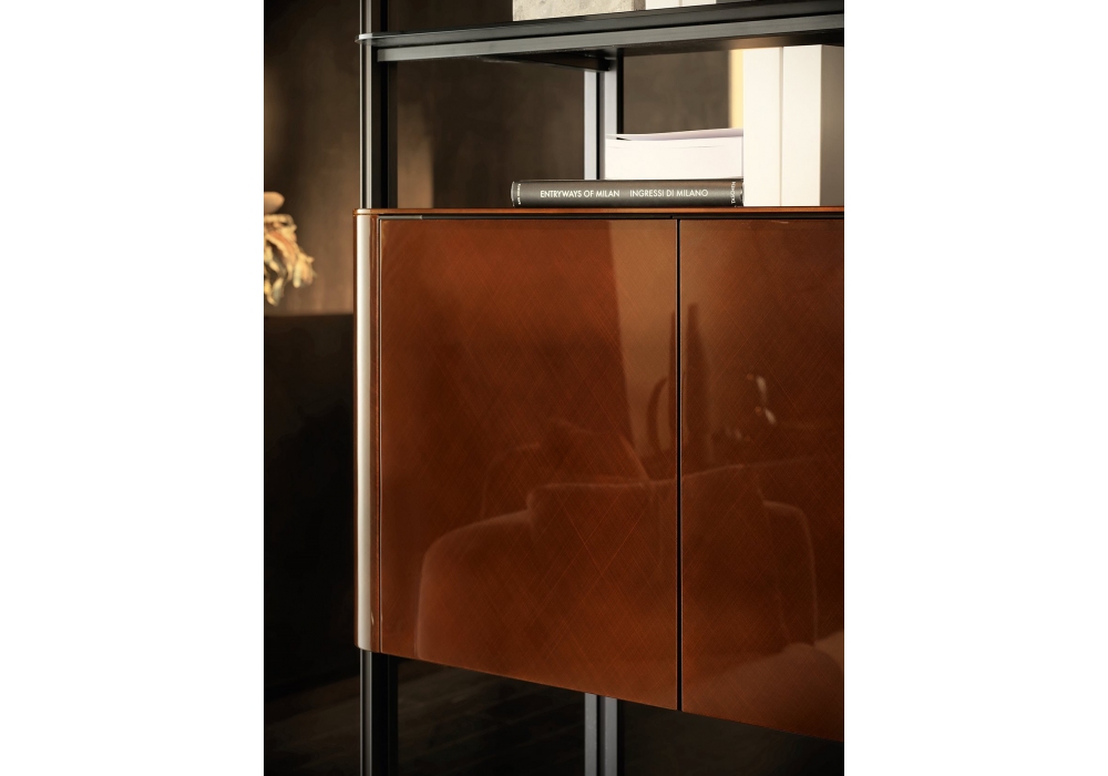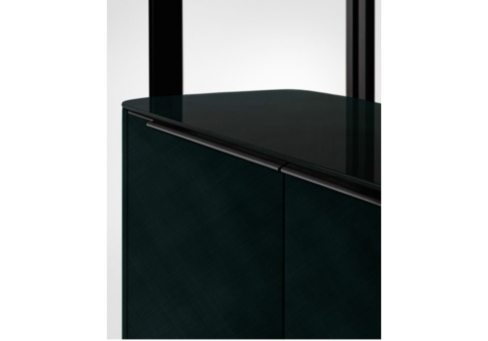 Syil designed by Oscar & Gabriele Buratti for Gallotti&Radice is a shelving system with black anodised aluminium supports with bright brass details. 8mm tempered shaped bright black painted smoked "grigio Italia" glass shelves. Wooden glossy lacquered door, flap door or drawer units in the artisanal and exclusive finish Prussian Blue or Cognac. Also available in the glossy lacquered version in the colours blue-grey, liquorice and black. Black open pore lacquered ash interior.