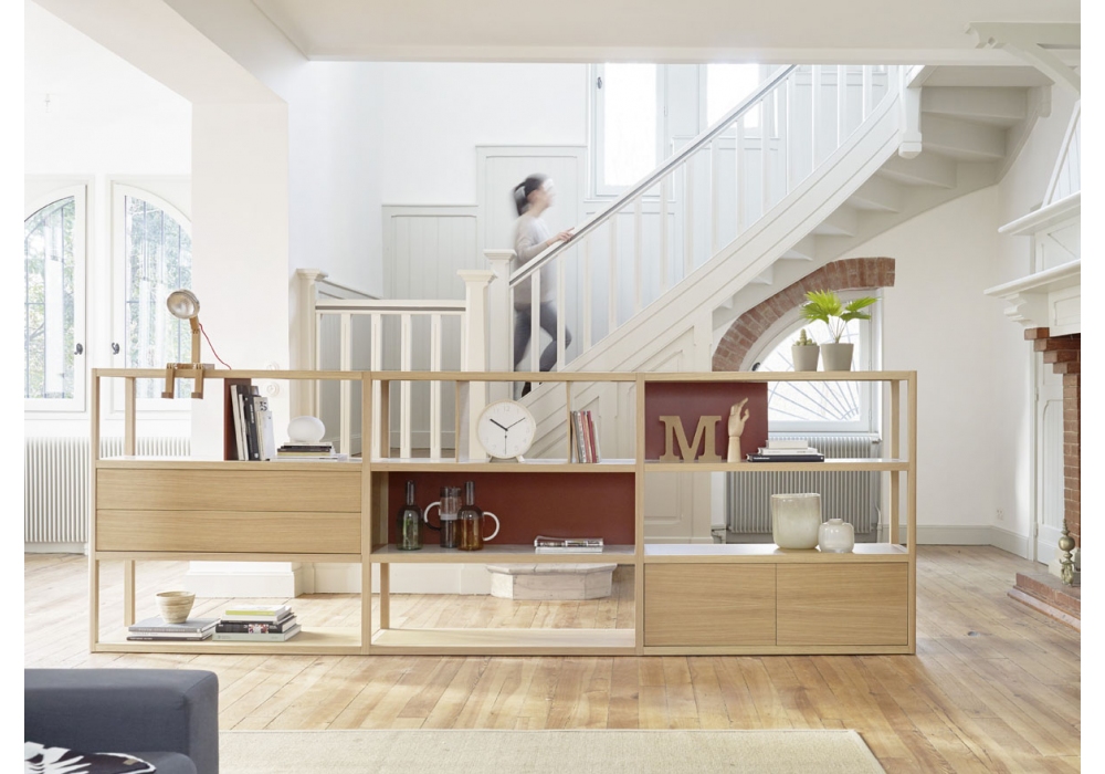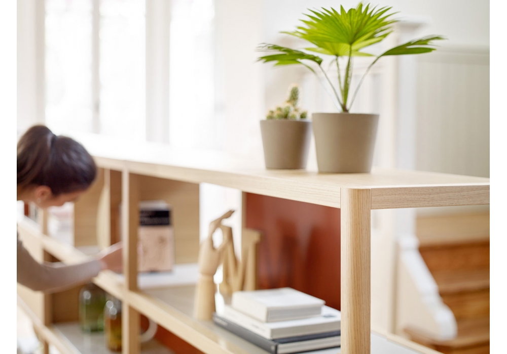 Kai designed by Iratzoki Lizaso for Treku is a modular wooden bookcase available in different wood finishes, with back panels in lacquered wood in the available finishes and rounded profiles.