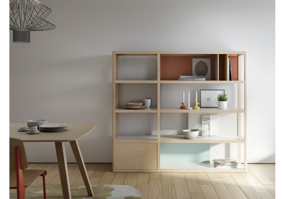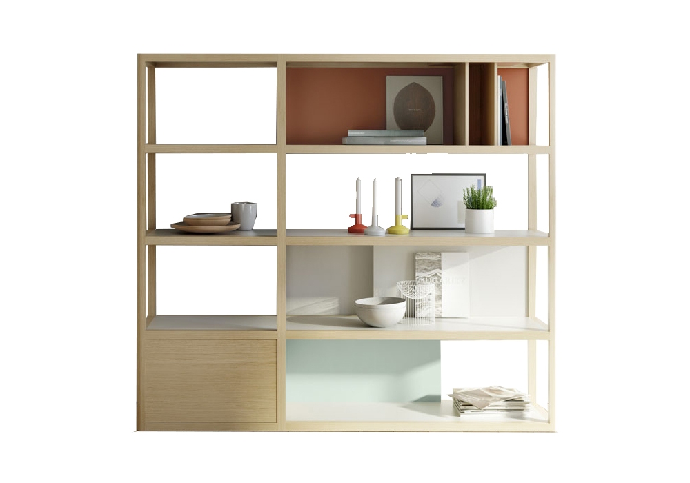 Kai designed by Iratzoki Lizaso for Treku is a modular wooden bookcase available in different wood finishes, with back panels in lacquered wood in the available finishes and rounded profiles.