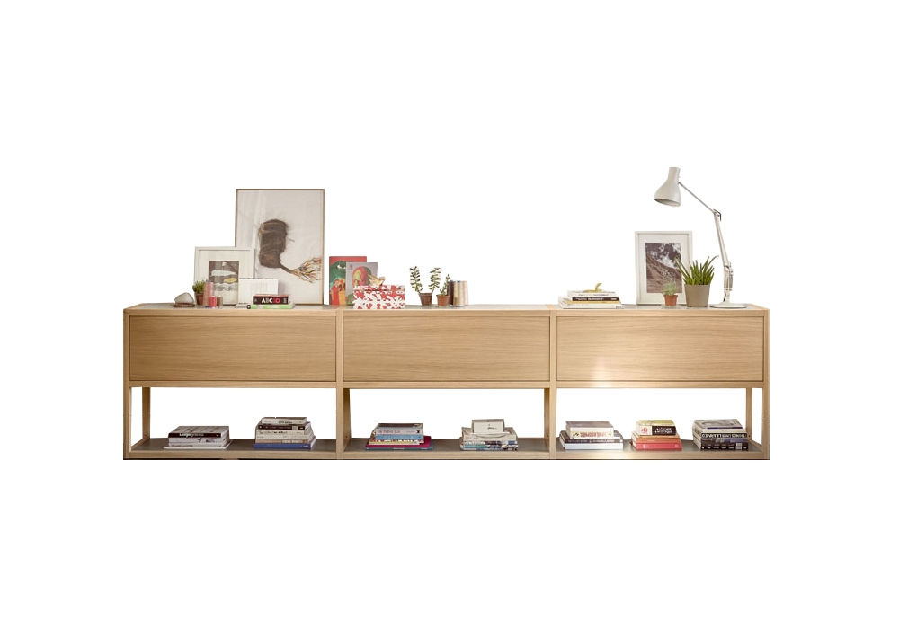 Kai designed by Iratzoki Lizaso for Treku is a wooden bookcase available in kai light and kai black, with some parts closed with a flap door in the same finish. Shelf under lacquered and the marble top.