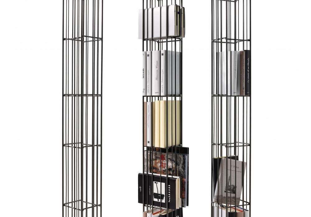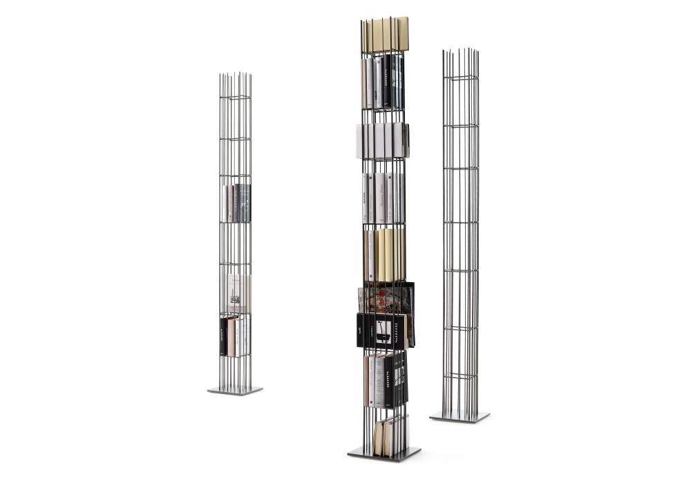 Metrica Tower designed by Ctrlzak Studio for Mogg is a freestanding bookshelf made of iron rod in burnished finish.