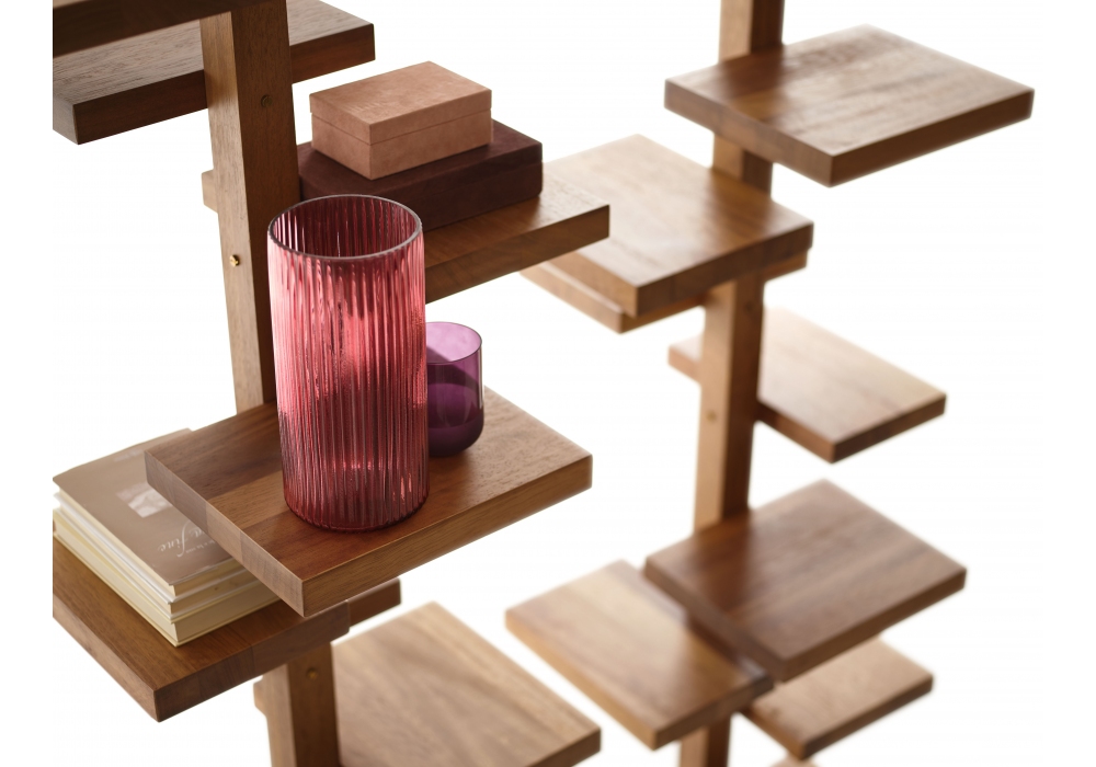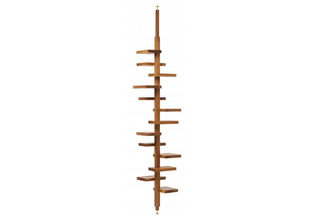 Adelaide Wood designed by Claudio Bitetti for Mogg is a shelving system made of Iroko solid wood with 13 shelves, prepared for fixing to the ceiling. Adelaide is an elegant bookcase, forced between floor an ceiling with a vertical stick with square section where are fixed asymmetrically on the 4 sides the shelves of two different sizes. Adelaide can be used as a partition, as a bookcase able to personalize any environments also of the corners.