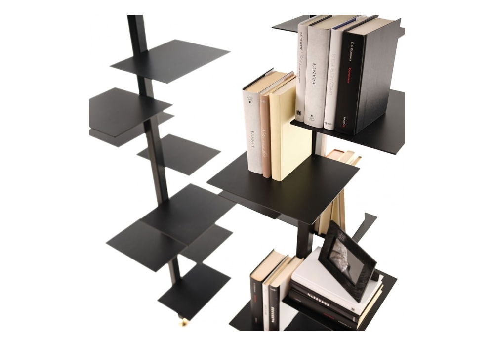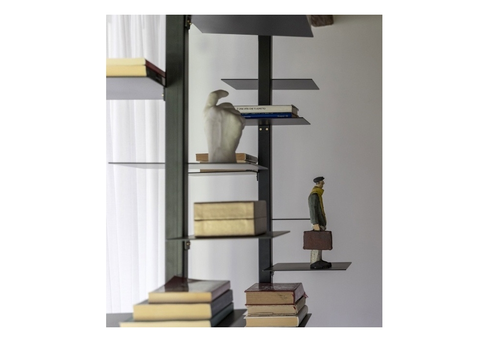 Adelaide Metal designed by Claudio Bitetti for Mogg is a shelving system with structure in matt black painted metal and 13 shelves, prepared for fixing to the ceiling. Adelaide is an elegant bookcase, forced between floor an ceiling with a vertical stick with square section where are fixed asymmetrically on the 4 sides the shelves of two different sizes. Adelaide can be used as a partition, as a bookcase able to personalize any environments also of the corners.
