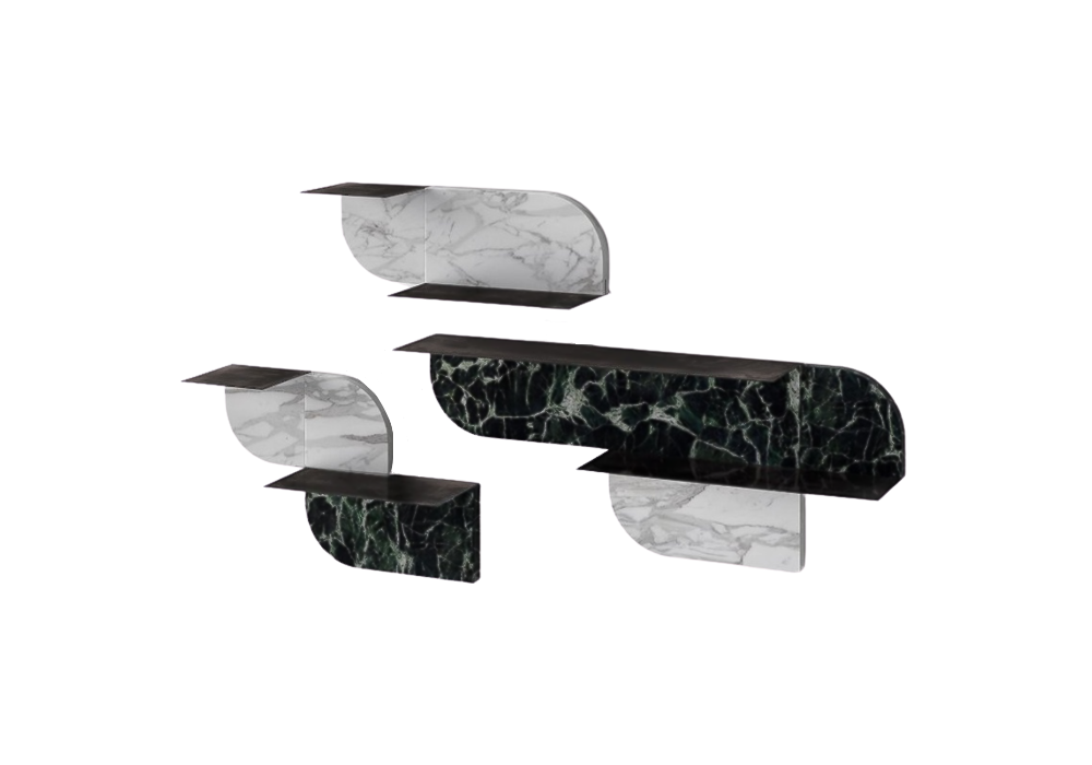 Roundcut designed by Studiopepe for Gallotti & Radice is a shelving system in burnished metal. Marble front available in different finishes. Left and right version for each size (small, medium, large). The shelves can be installed in two different positions (with shelf above or below), by rotating them 180 °.