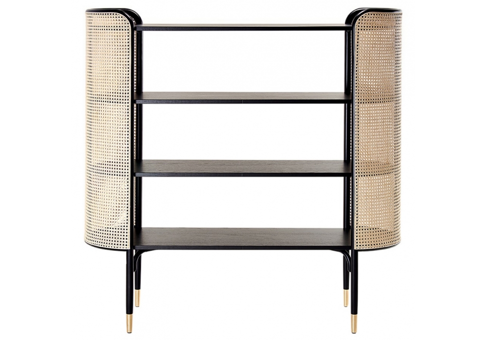 Mos designed by GamFratesi for Gebrüder Thonet Vienna is a bookcase with bent beech-wood frame and woven cane inserts. Open pore painted shelves in ash veneer. Brass feet.