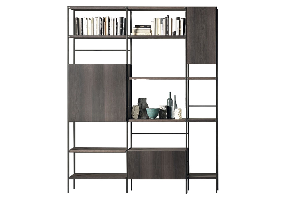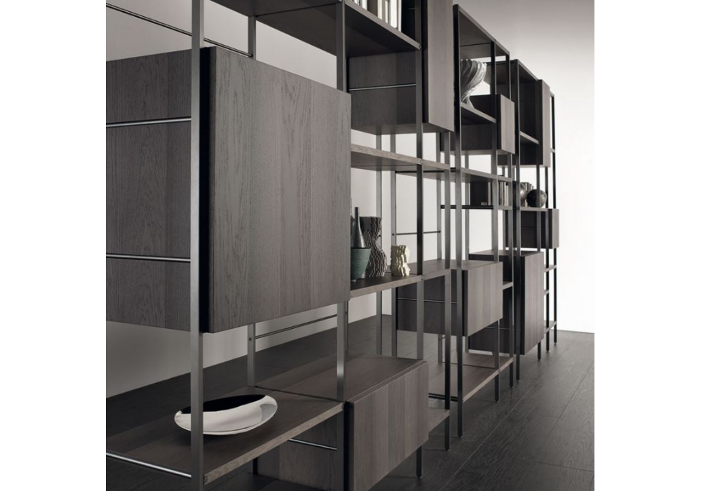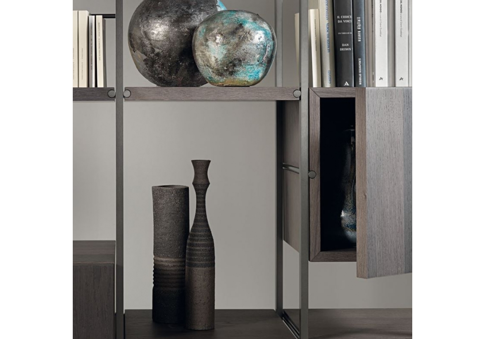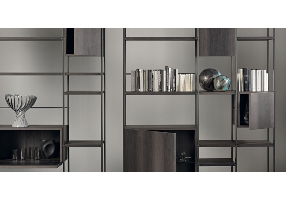 Outline designed by Giacomo Moor for Acerbis is a bookcase with metal structure and shelves and cabinets in different wood essence. Its peculiarity lies in the coupling between shelves and structure, through circular milling on shelves and containers, which allow you to slide the elements in the structure.